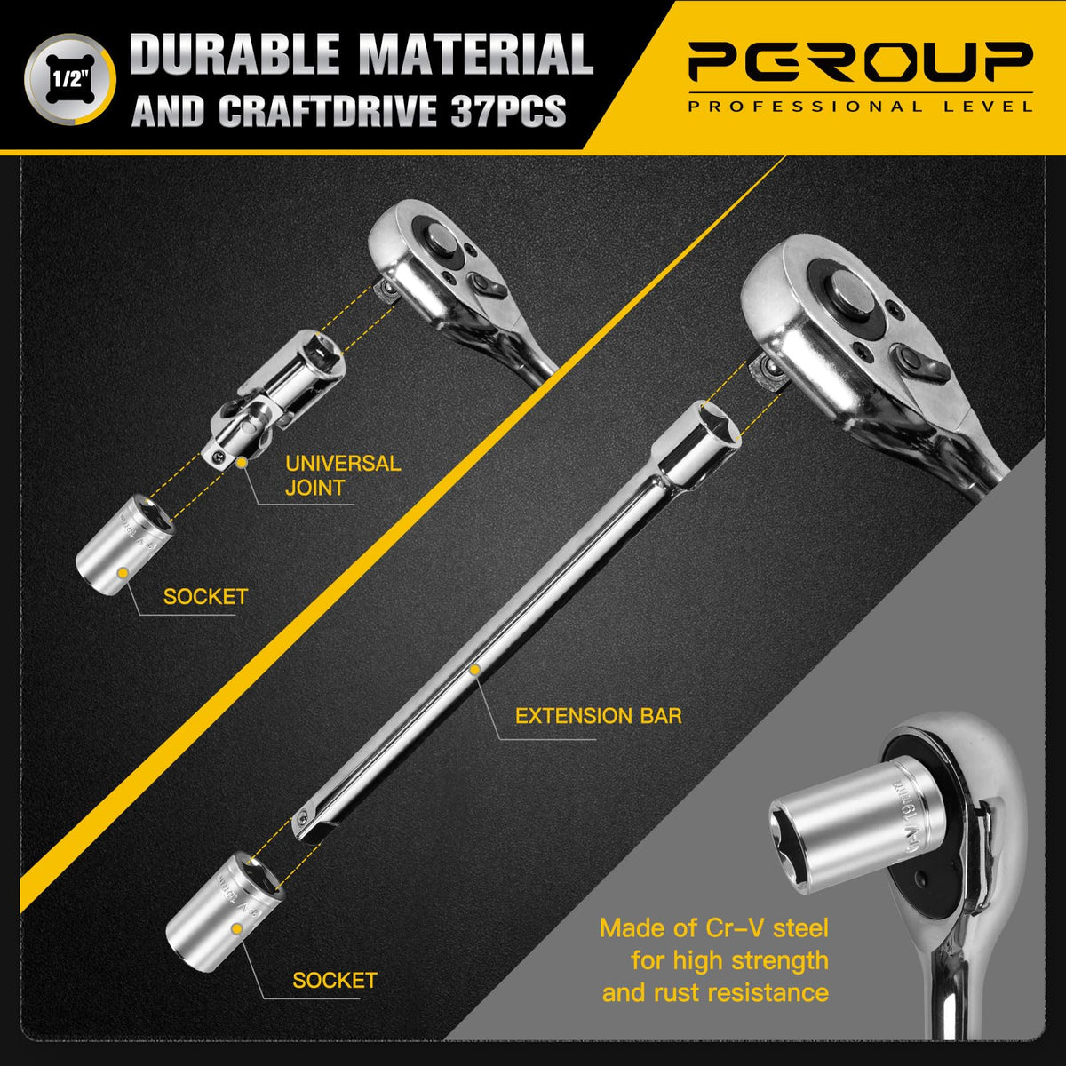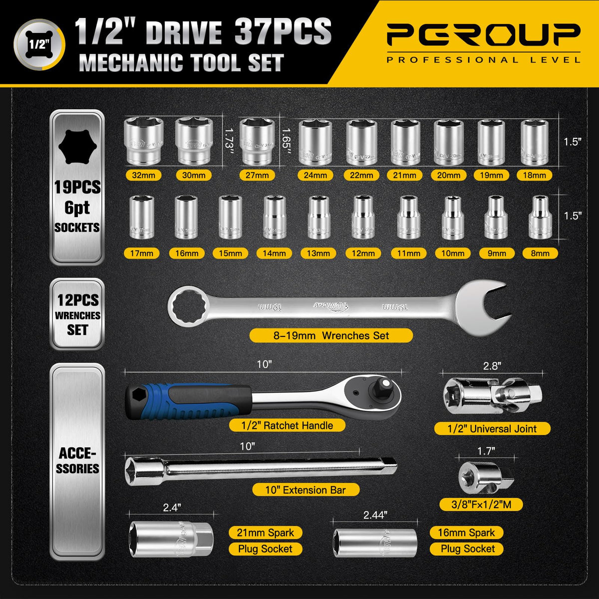 Pgroup 1/2 Inch Drive Metric Socket Set 8-32Mm & Combination Wrench Set 8-19Mm, 37Pcs Mechanic Tool Set For Auto And Bike Repair