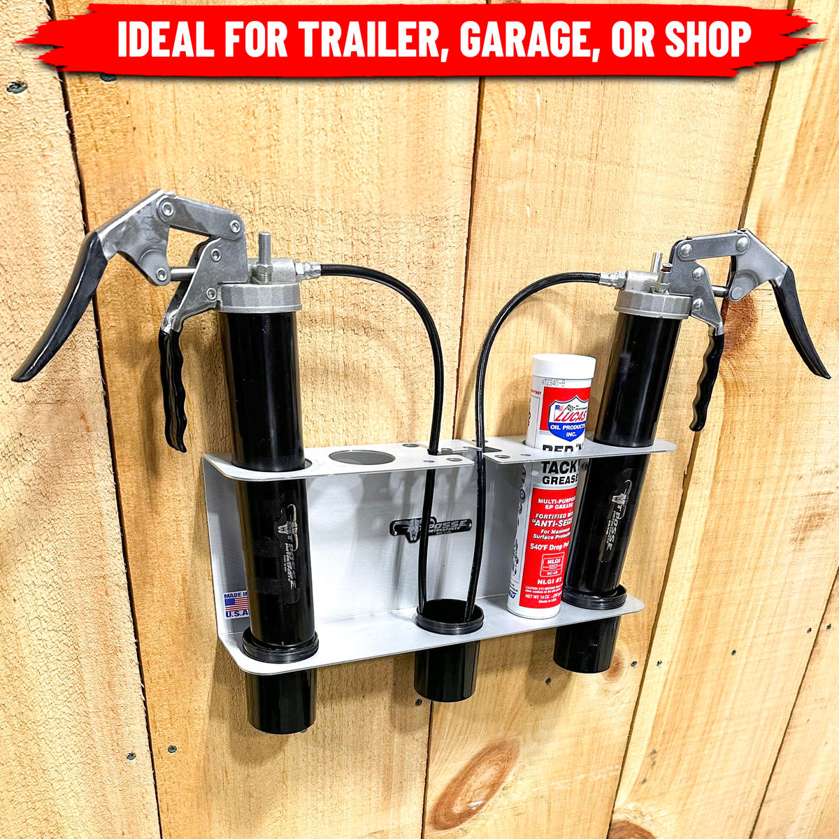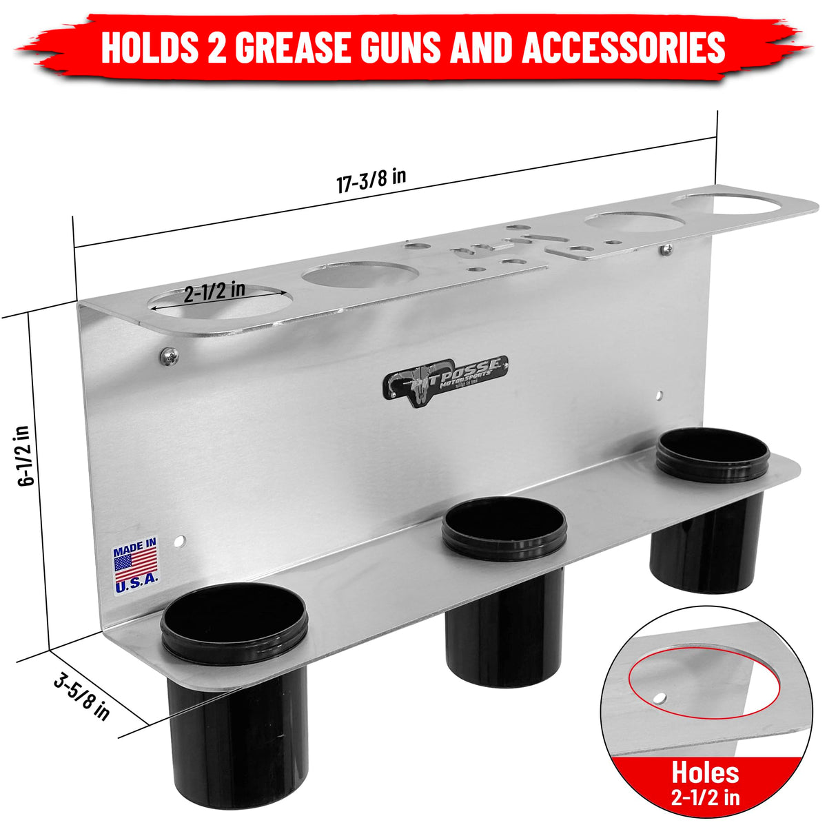 Pit Posse Pp3363 Hand Grease Gun Tube Holder Rack - Made In Usa - Holds 2 Grease Guns- Garage Organizer Aluminum Storage Caddy W