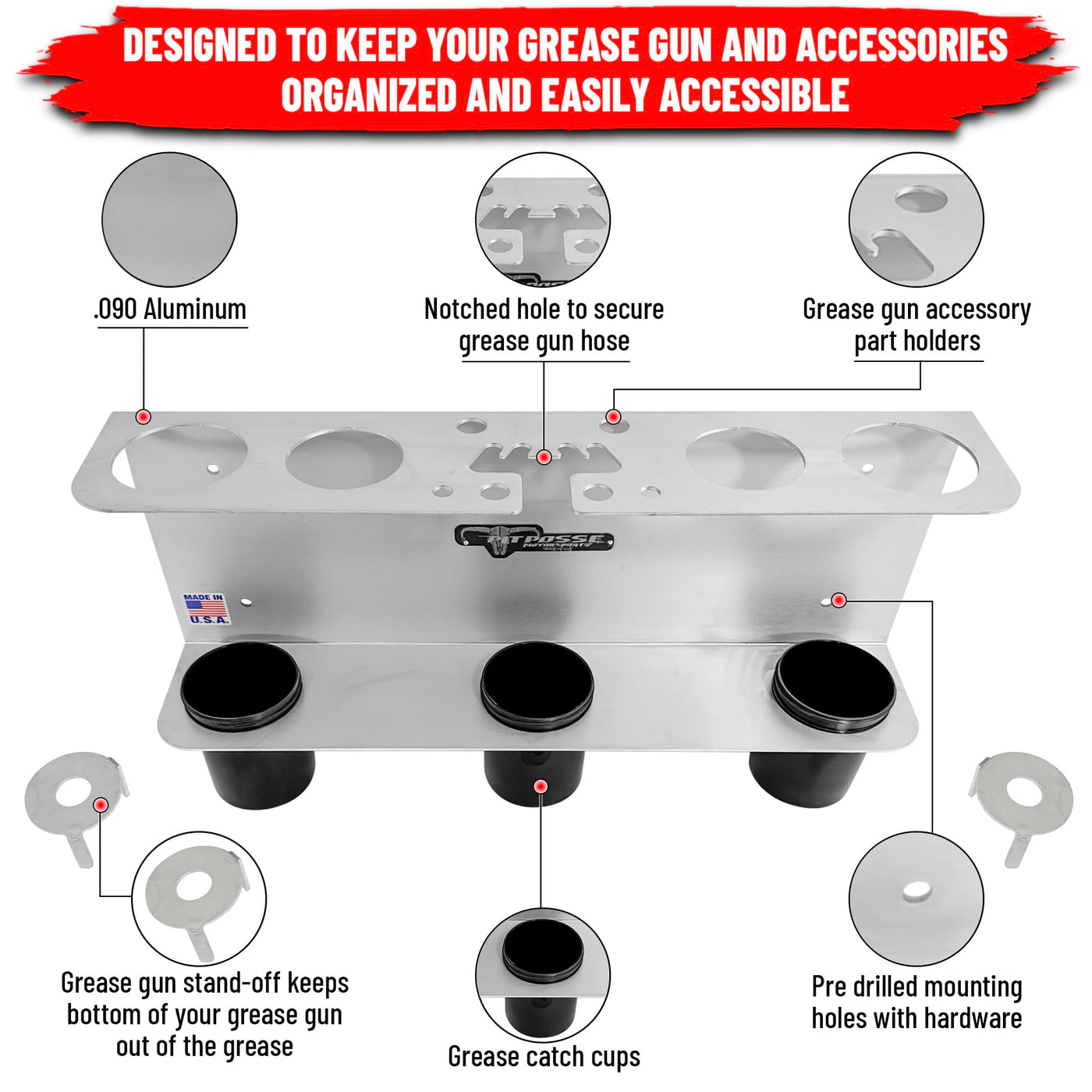?? Proudly Engineered And Manufactured In The Usa!?? One Of A Kind Item To Store Your Grease Gun Without The Mess?? Dimensions (Inches): 17 3/8'' Length X 3 5/8'' Wide X 6.5'' Tall ?? Notched Hole To Secure Your Grease Gun Hose, 2 Grease Catch Cups To Prevent Spills, And Grease Gun Stand Off To Prevent Your Grease Gun From Sitting In Grease?? Predrilled Mounting Holes And Hardware Included For A Quick And Easy Installation?? Made With Aluminum For Superior Strength And Durability