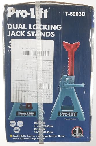 Pro lift T-6903D is a 3-ton double locking jack stands. It features a high quality cast ductile Iron Ratchet bar and sturdy stamped steel base provide durability and longevity which makes ideal for home, professional and farm use. Always used in pairs, counter weighted pawls serve as a safe secure locking device to prevent the load from accidental disengagement. An attached pin lock provides support, locking the ratchet bar in place for an additional carrying point. One-piece, multi-position ductile ratchet bar provides strength and durability as well as a quick adjustment mechanism that securely locks into the desired position.