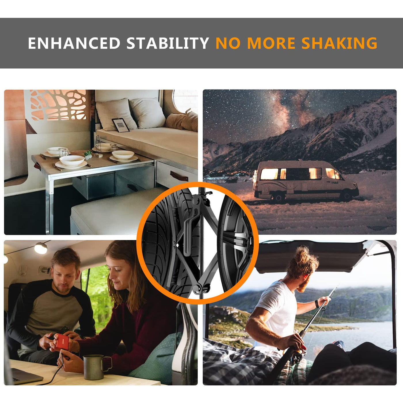 Suitable for the tightest distance of wheel down to 2' and extends to 10'; Use for Travel Trailers, Campers, Class A Moto Home, Fifth Wheel Trailers, Heavy Duty Trucks, Toy Hauler, etc; New electrophoretic technology is adopted in the production of the surface to prevent rust; Applying an opposing force to the two tires to prevents wheel shift; Each box contain 2pcs Wheel Chock Scissor Stabilizers, 1 pc Crank Handle and 1 pc Socket Adapter