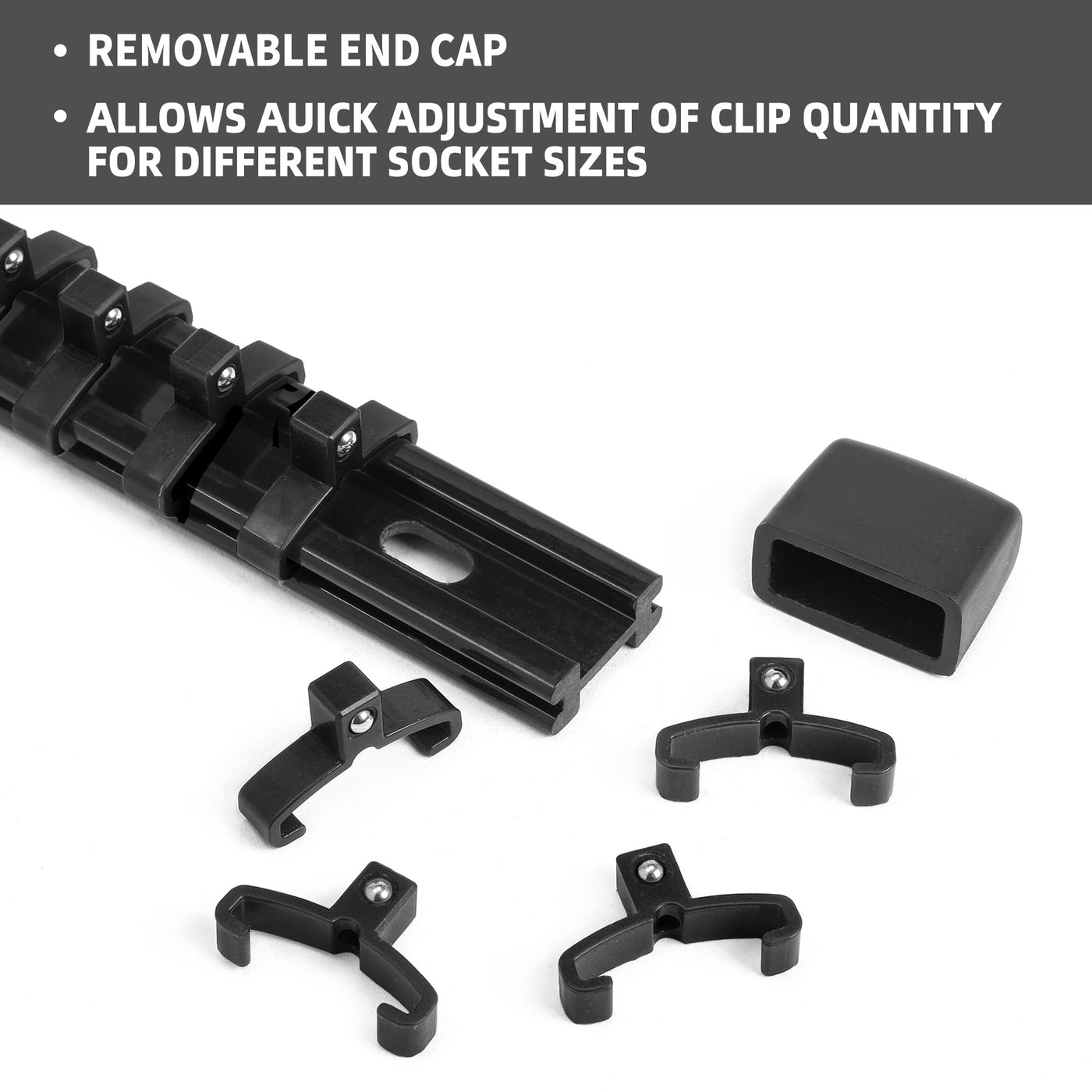 Q: Is the Reniteco Socket Organizer easy to use?A: Yes, the organizer features a removable end cap for convenient adding or removing of clips. Each clip is designed with spring-loaded ball bearings to securely hold sockets, making it easy to find the right tool when needed.