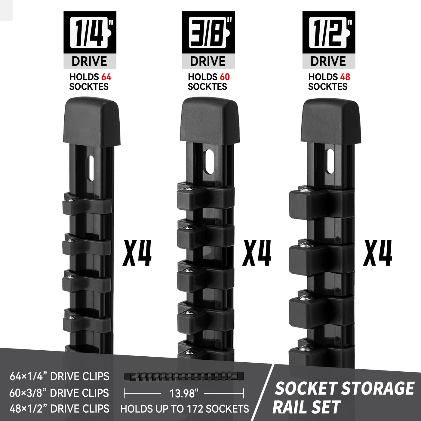 Q: How many sockets can the organizer hold?A: This socket organizer has a large capacity, capable of holding up to 172 sockets with clips in sizes of 1/4" x 64, 3/8" x 60, and 1/2" x 48.
