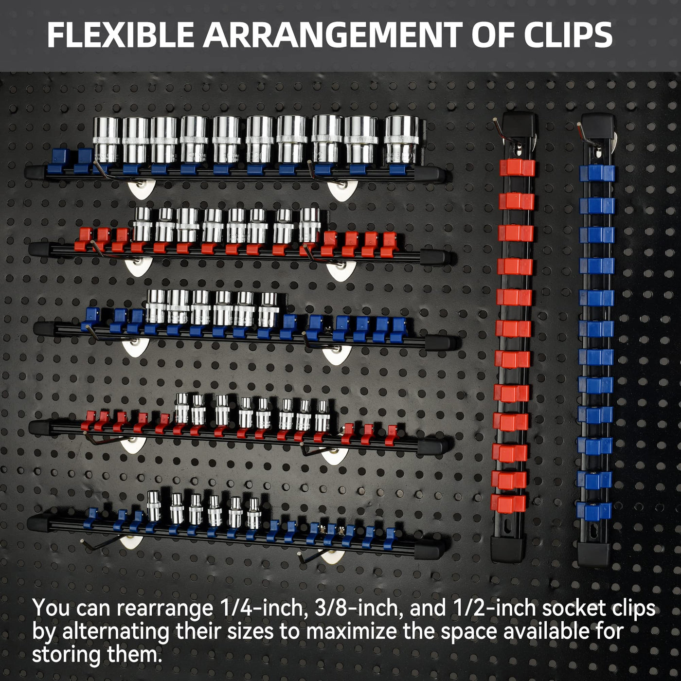 Q: How many sockets can the Reniteco Socket Organizer hold?A: This organizer has a large capacity and can hold up to 258 sockets. It comes with clips in sizes of 1/4" x 96, 3/8" x 90, and 1/2" x 72, ensuring that you have enough space for all your essential tools.
