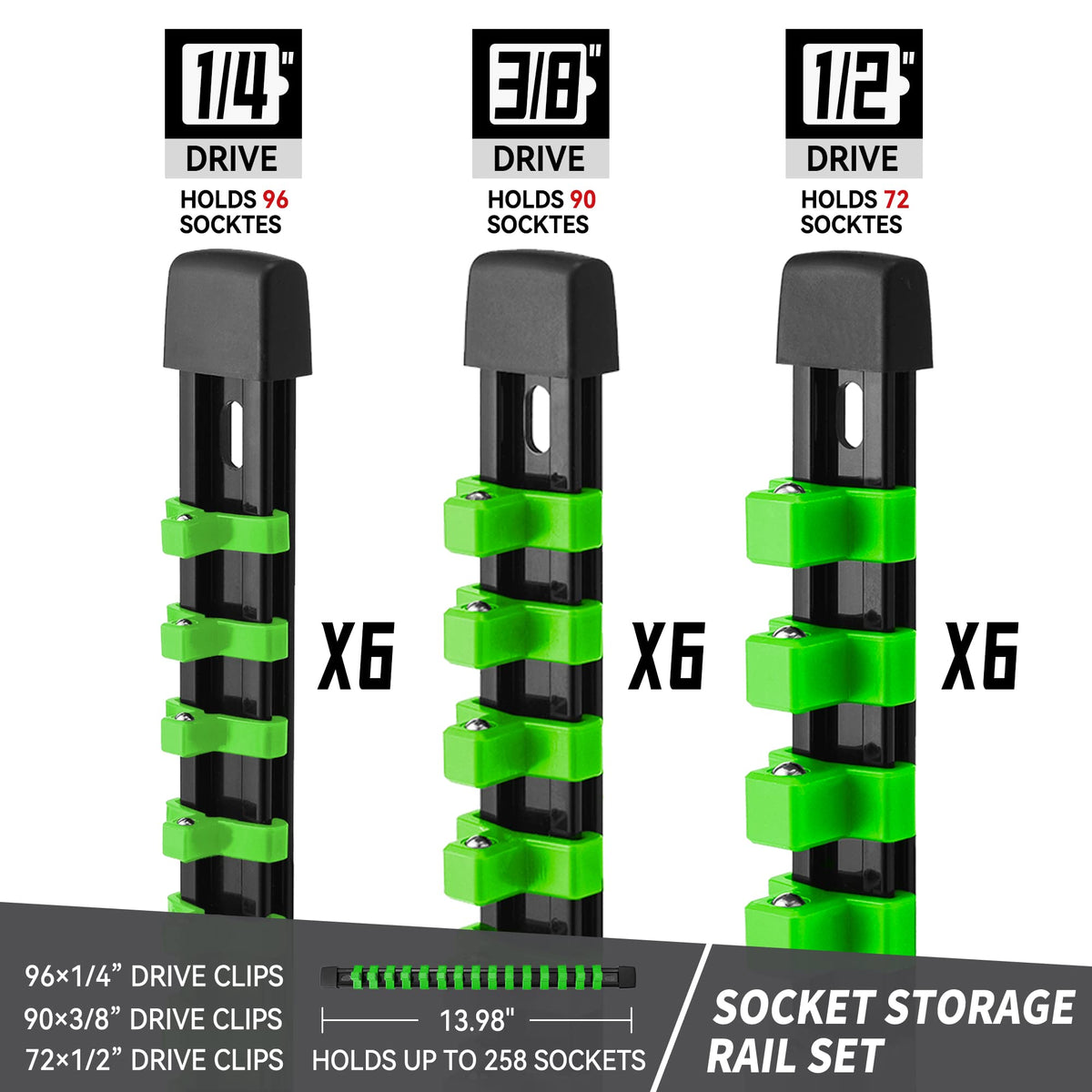 Reniteco Socket Organizer Drive Abs Tools - Green Socket Holder, Premium Quality 18 Pieces Socket Holders Kit 1/4-Inch X 96 Clips, 3/8-Inch X 90 Clips, 1/2-Inch X 72 Clips(18Pc,Green)