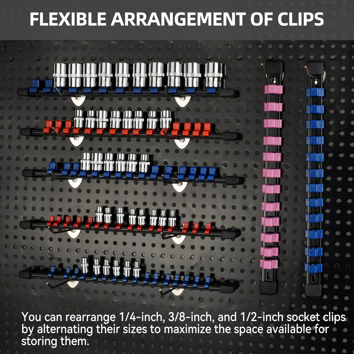Q: What sizes of sockets does the Reniteco Socket Organizer accommodate?A: The Reniteco Socket Organizer is designed to fit various socket sizes, including 1/4-inch with 64 clips, 3/8-inch with 60 clips, and 1/2-inch with 48 clips, making it highly compatible with most socket brands.