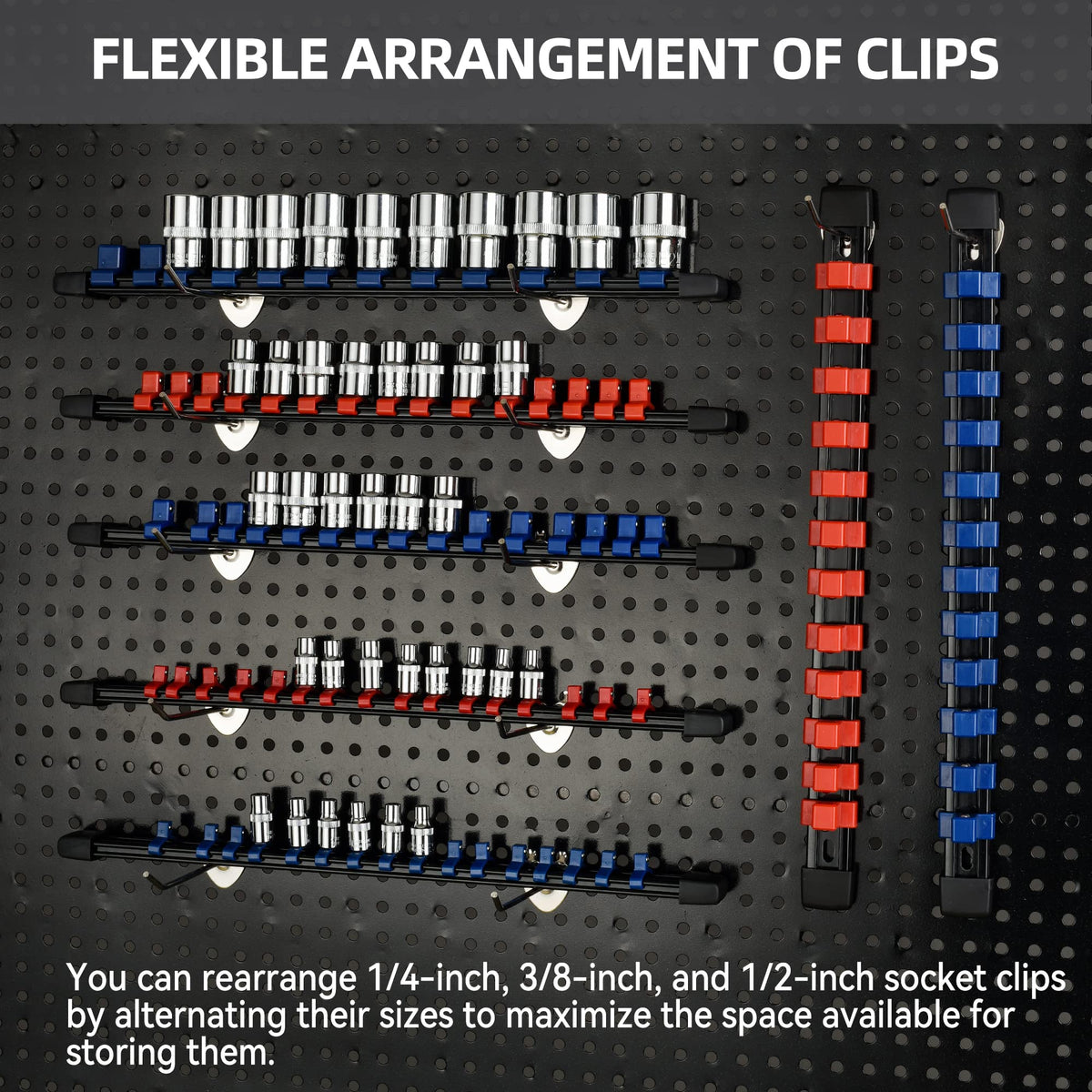 Q: What sizes of sockets does the Reniteco Socket Organizer accommodate?A: The Reniteco Socket Organizer is designed to hold a variety of socket sizes, specifically accommodating 1/4-inch sockets with 64 clips, 3/8-inch sockets with 60 clips, and 1/2-inch sockets with 48 clips.