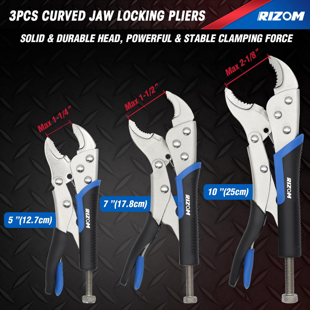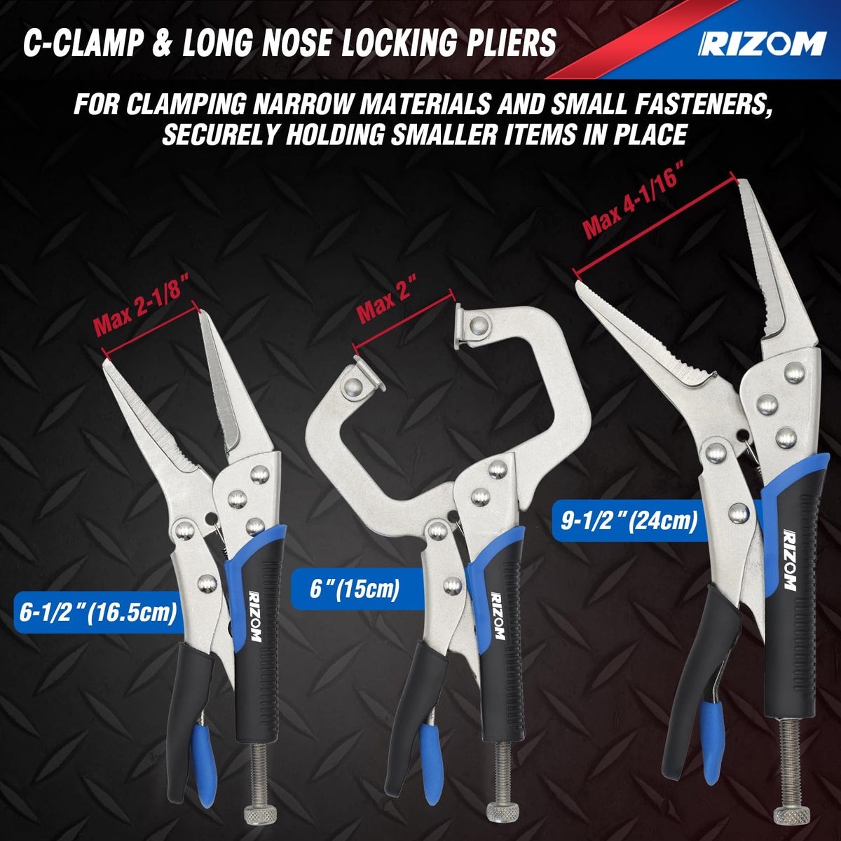 Q: What sizes are included in the Rizom Vice Grips Pliers Set?A: The Rizom Vice Grips Pliers Set includes six pieces: 5-inch, 7-inch, and 10-inch curved jaw locking pliers, 6-1/2-inch and 9-1/2-inch long nose locking pliers, and a 6-inch locking c-clamp.