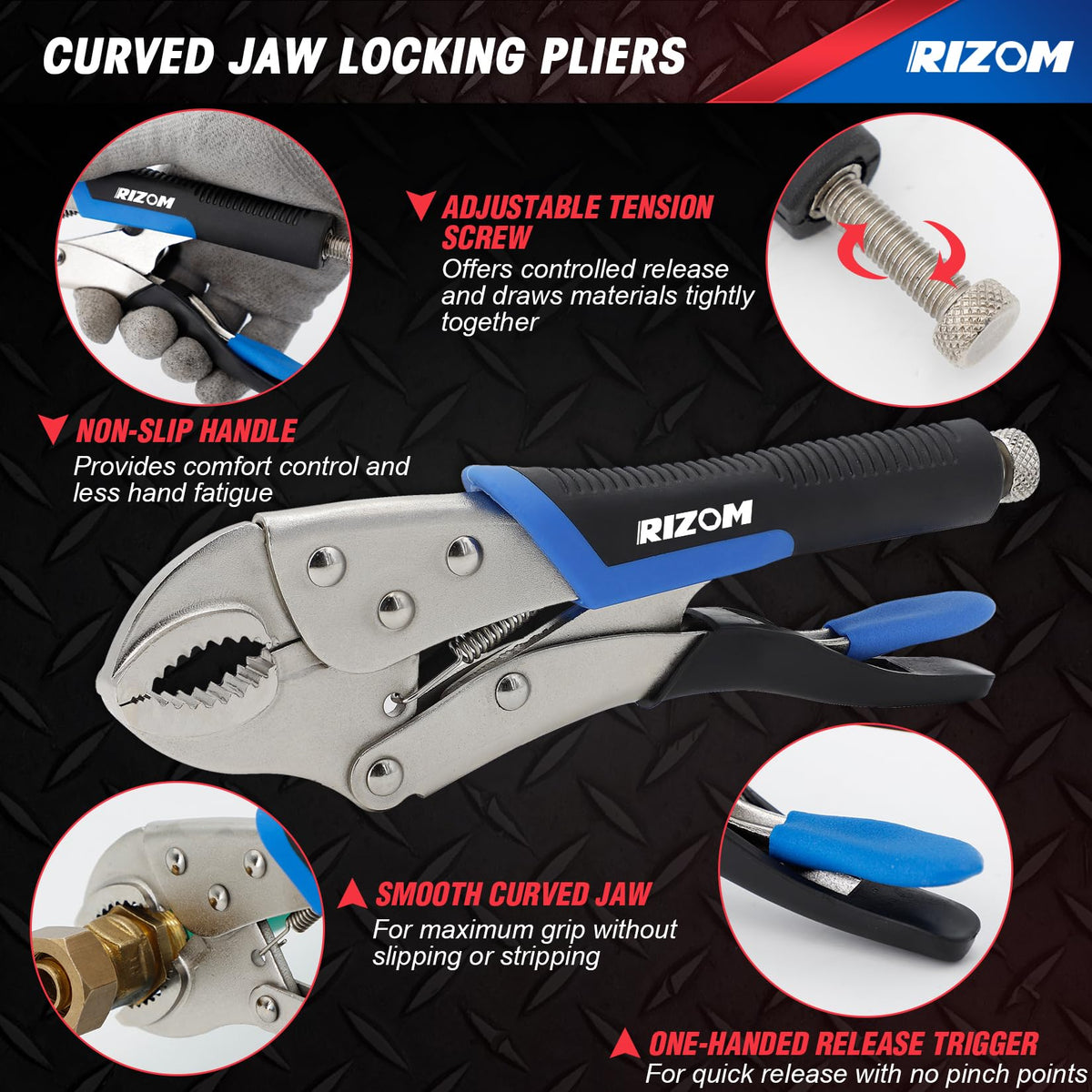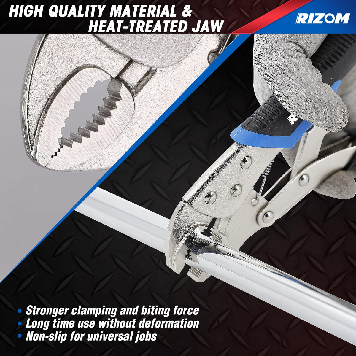 Rizom Vice Grips Pliers Set, 6-Piece Locking Pliers Set, 6-1/2”, 9-1/2” Needle Nose Vice Grips, 5”, 7” And 10” Curved Jaw Vise Grip Pliers, 6” C-Clamp Locking Pliers, Fast Release With Rolling Pouch