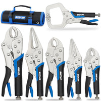 ?Wild Size Selection?6-Piece Locking Pliers Set Including 5', 7' & 10' curved jaw locking pliers (Max jaw capacity: 1-1/4', 1-1/2' & 2-1/8 '), 6-1/2' & 9-1/2” long nose locking pliers (Max jaw capacity: 2-1/8' & 4-1/16'), 6' locking c-clamp (Max jaw capacity: 2') ?Adjustable Tightening Screw?Vice grip pliers features different jaw openings, you can adjust tightening screw in order to get the perfect clamping pressure for your different projects. ?Ergonomic Grip? Locking pliers with soft TPR material in ergonomic design provides extra comfort and reduce hand fatigue. More efficient, operating with less effort. ?Wide-Application?Vise grip pliers set have wide application such as welding, metal bending, wooodworking, loosen bolts. Ideal for clamping, twisting and turning flat objects such as sheet metal. ?Easy To Store?6-Piece locking pliers are placed in a nice canvas bag, easy to access at any time. If you encounter any problems while using our products. Please contact us by email, our professional after-sales team will contact you and solve your problems in time.
