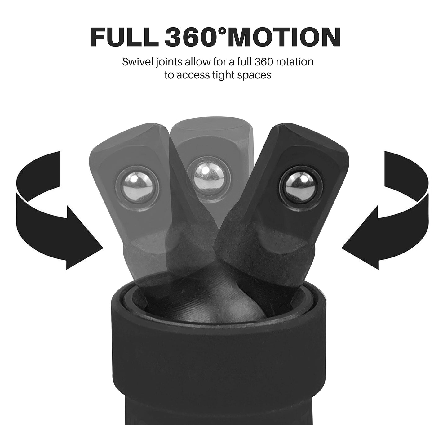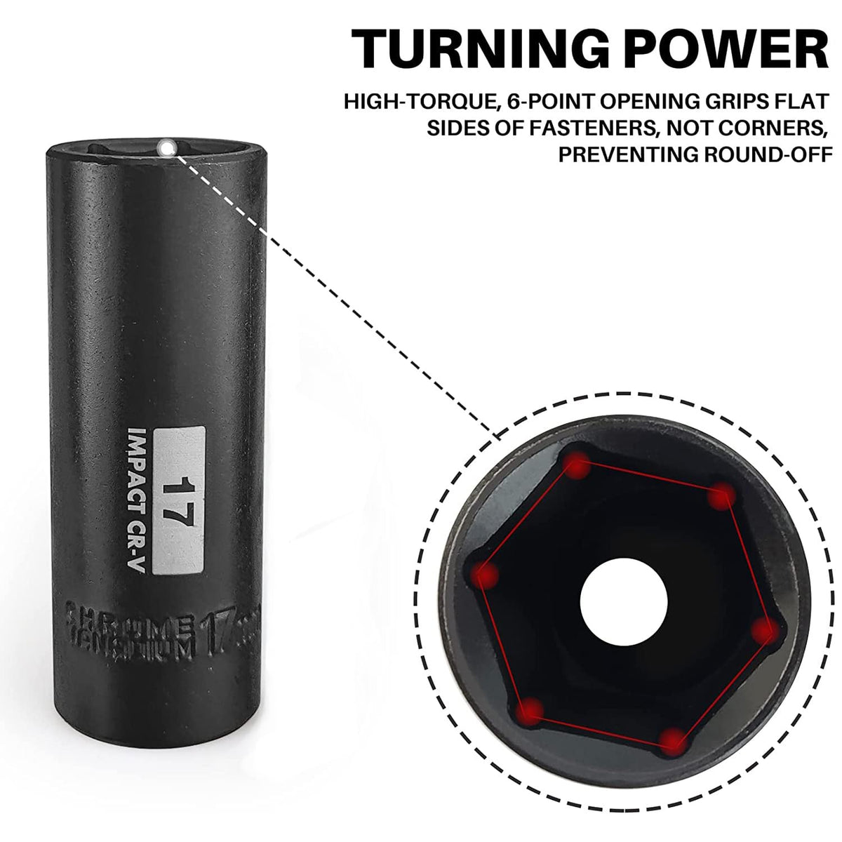 【Package Include】: [SAE]: 16Pieces Deep and Shallow: 5/16", 3/8", 7/16", 1/2", 9/16", 5/8", 11/16", 3/4". [Metric]: 28 Pieces Deep and Shallow: 8mm, 9mm, 10mm, 11mm, 12mm, 13mm, 14mm, 15mm, 16mm, 17mm, 18mm, 19mm, 21mm, 22mm. [Accessories]: 3", 6" Extension Bars, 3/8" Universal Joint, 1/2" to 3/8" Adapter, 3/8" Socket Adapter. 【Material】: 49 pieces impact socket set are made of chrome vanadium steel alloy (Cr-V),with a black phosphate protective coating,have good hardness and toughness. 【Design】:High-torque, 6-point opening grips flat sides of fasteners, not corners, preventing round-off.Extra-deep broach accommodates longer fasteners, Engineered for use with impact drivers. 【Clearly Size】:High-contrast size marking is permanently laser etched and easy to read, even in low light. 【Easy to carry】:Our Socket Set come with a heavy duty blow molded storage case, easy to carry, transportation and safe storage.