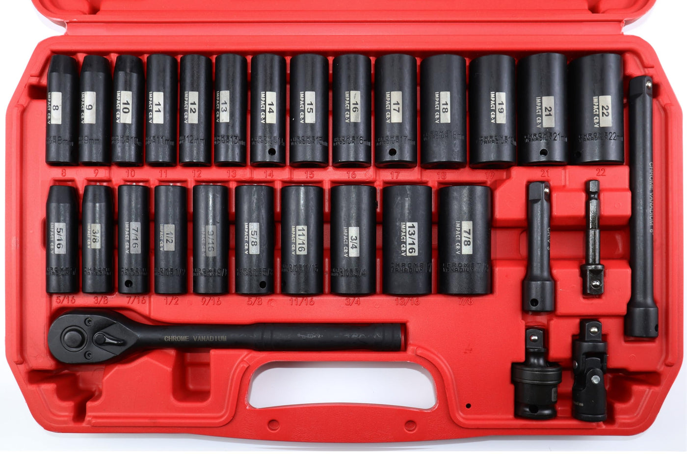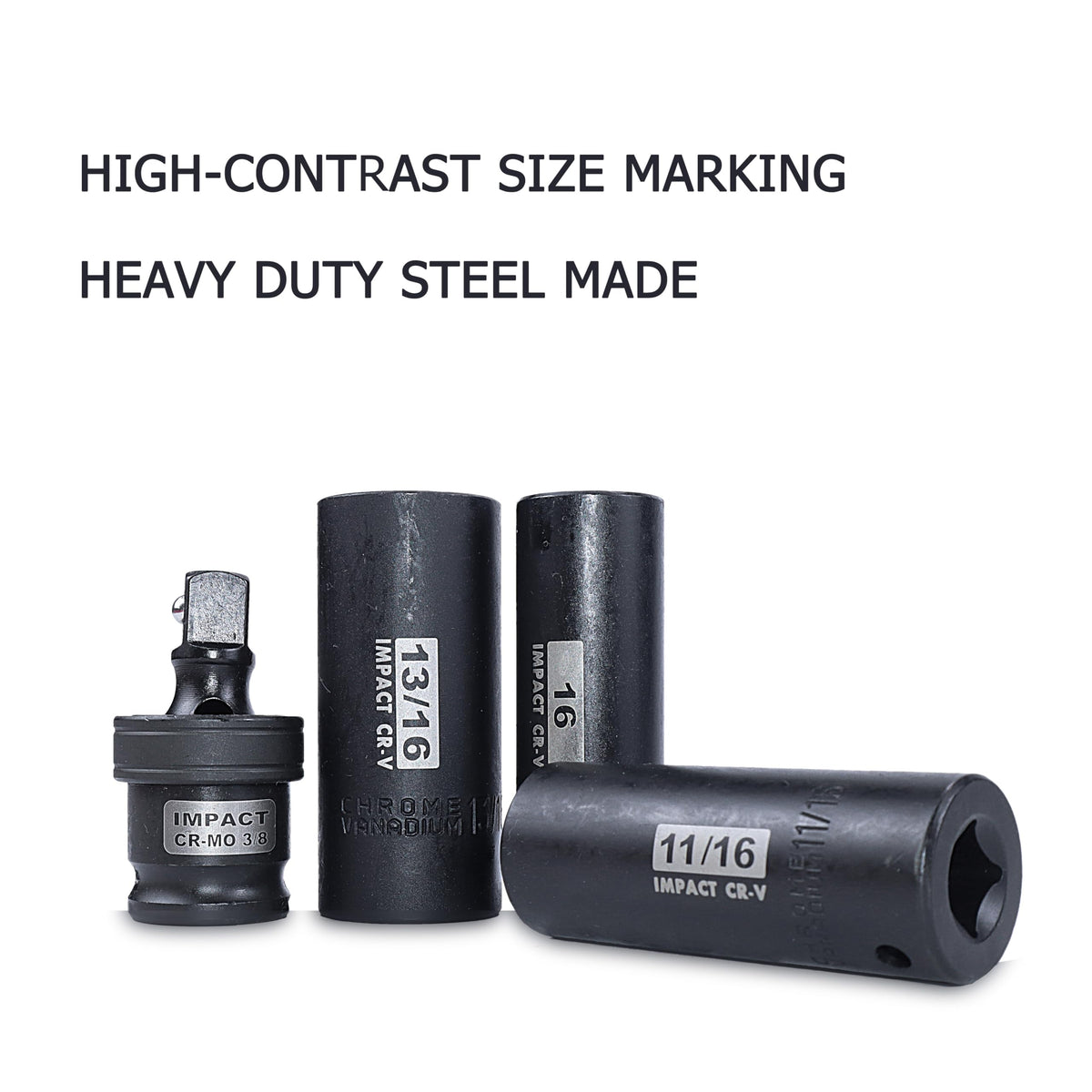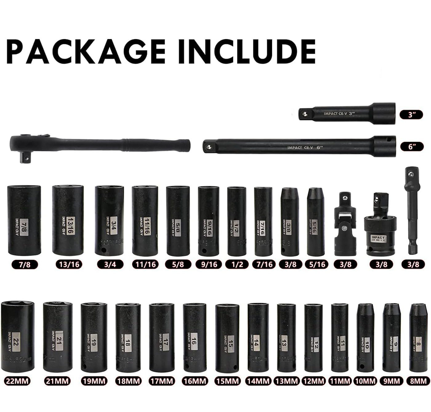 【Package Include】: [SAE]:5/16,3/8,7/16,1/2,9/16,5/8,11/16,3/4,13/16,7/8.[METRIC]:8mm, 9mm, 10mm, 11mm, 12mm, 13mm, 14mm, 15mm, 16mm, 17mm, 18mm, 19mm, 21mm, 22mm. [Accessories]: 3", 6" Extension Bars, 3/8" Universal Joint,3/8" Impact Universal Joint,3/8" Ratchet Handle,3/8"drill adaptor. 【Material】: 30 pieces impact socket set are made of chrome vanadium steel alloy (50BV30),with a black phosphate protective coating,have good hardness and toughness. 【Design】:High-torque, 6-point opening grips flat sides of fasteners, not corners, preventing round-off.Extra-deep broach accommodates longer fasteners, Engineered for use with impact drivers. 【Clearly Size】:High-contrast size marking is permanently laser etched and easy to read, even in low light. 【Easy to carry】:Our Socket Set come with a heavy duty blow molded storage case, easy to carry, transportation and safe storage.