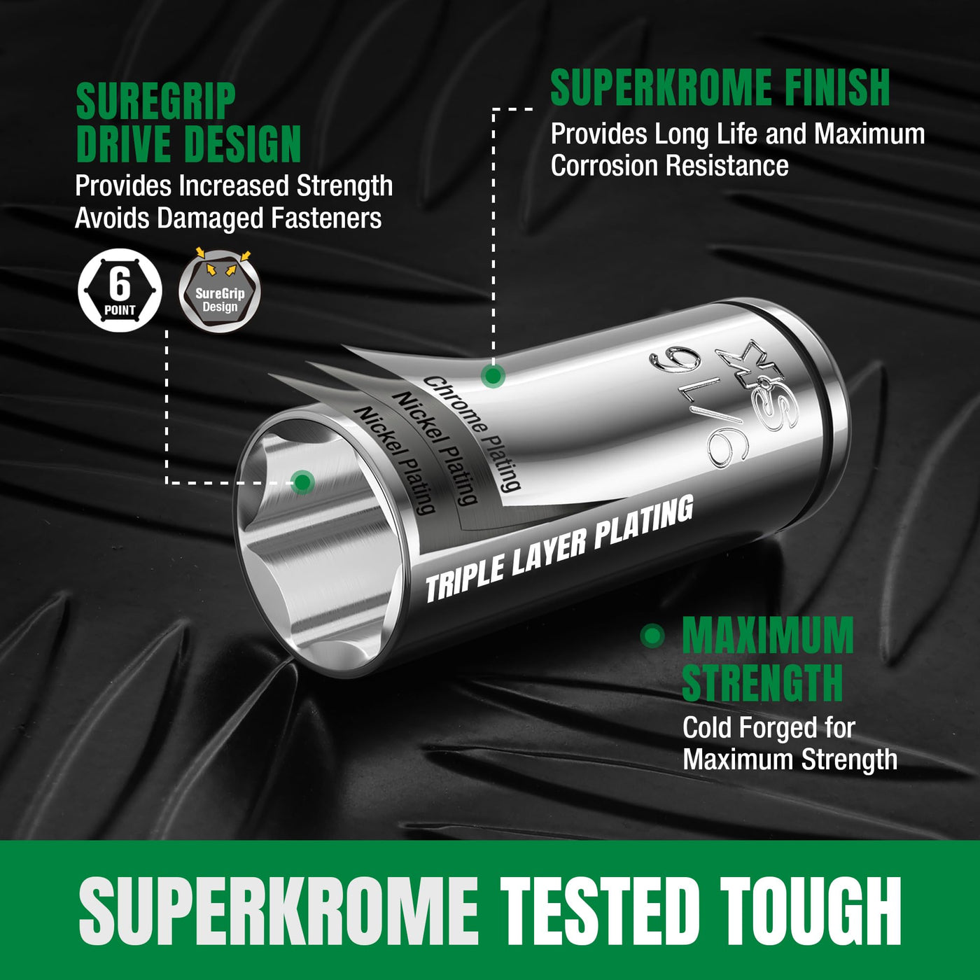 Q: What sizes of sockets are included in the 50-piece set?A: This 50-piece set includes 24 metric shallow and deep sockets ranging from 4 mm to 14 mm, and 22 SAE shallow and deep sockets ranging from 5/32 inch to 9/16 inch, providing a comprehensive range for various applications.