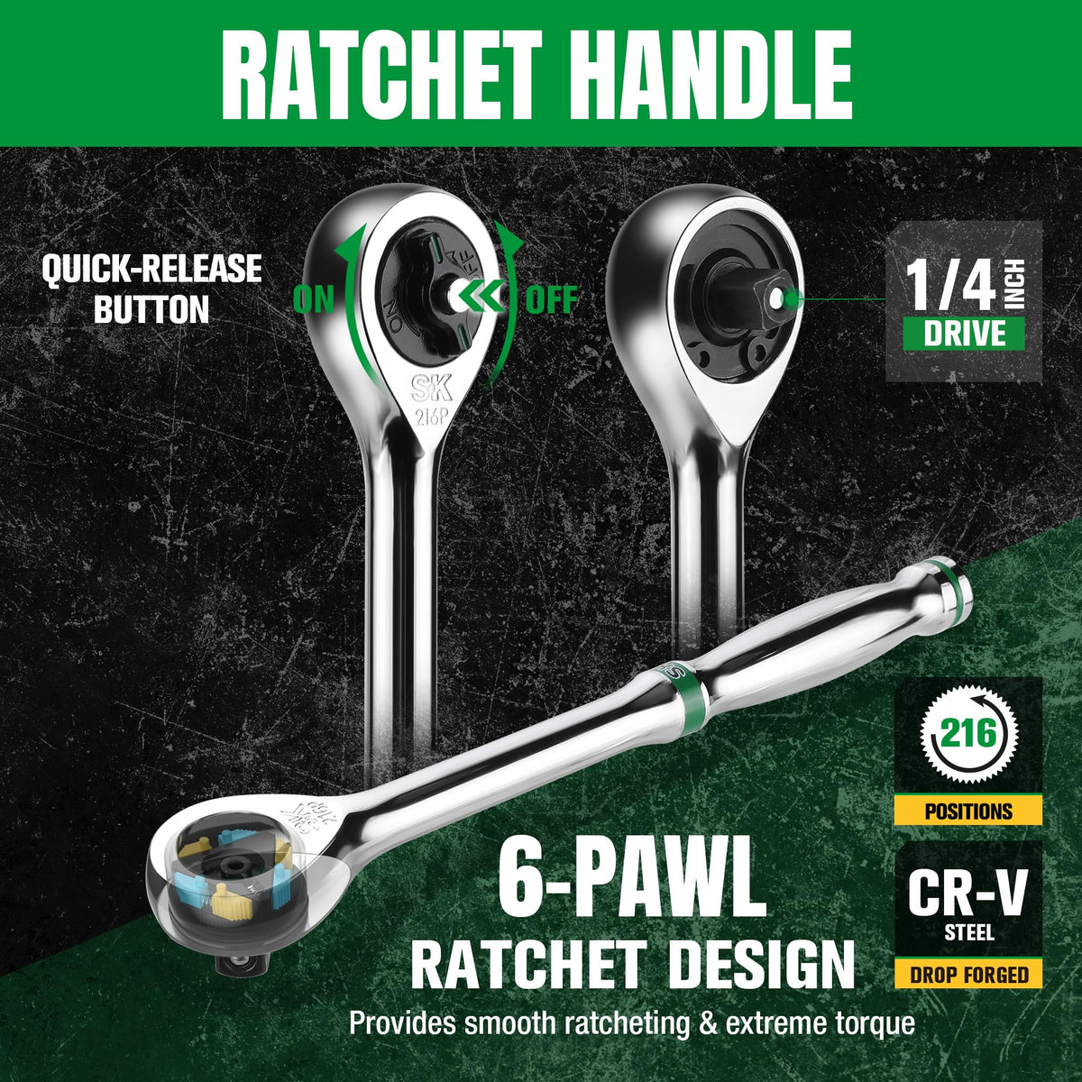 Q: How does the quick-release ratchet function in this socket set?A: The quick-release ratchet in the SK socket set allows for easy socket changes. With a simple press of the button, you can quickly lock and replace sockets, making your work more efficient.