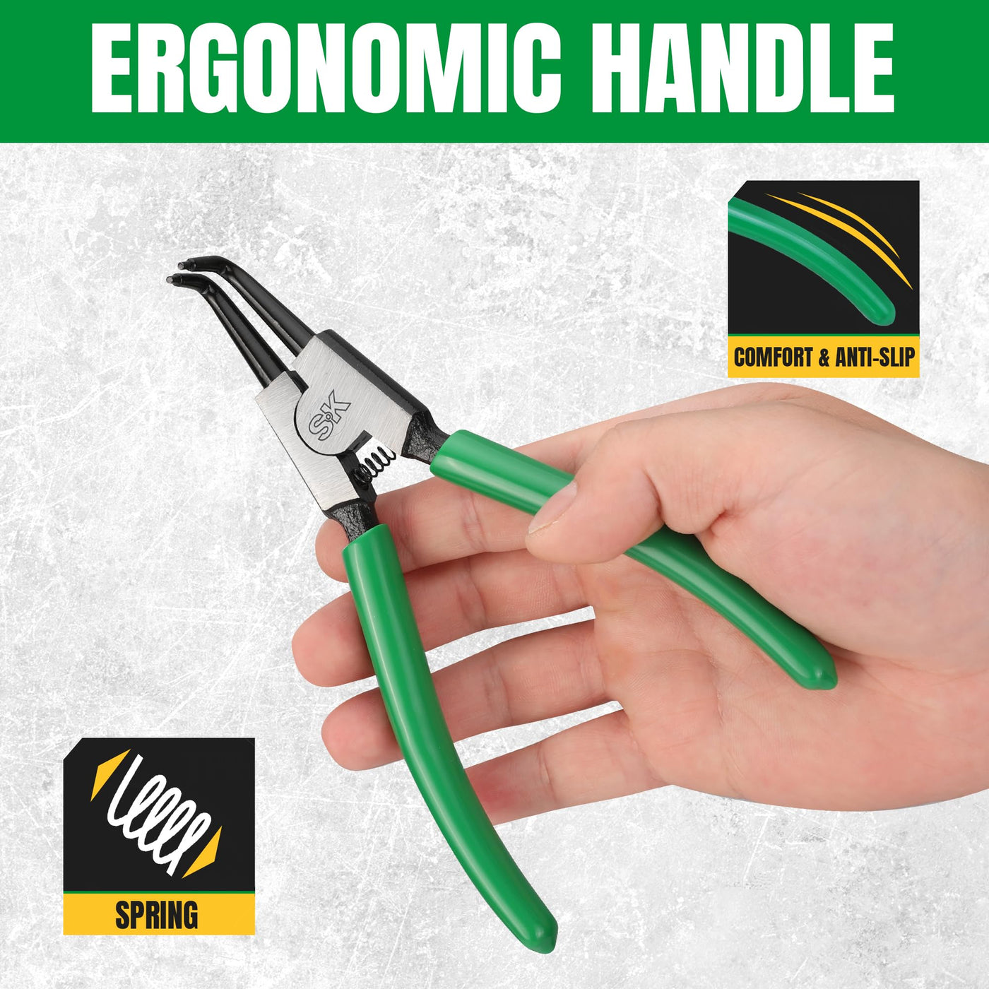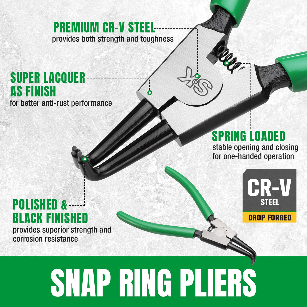 Q: What material are the SK snap ring pliers made from?A: The SK snap ring pliers are crafted from premium Chromium-Vanadium (CR-V) steel, ensuring durability and resistance to rust due to their black finish.