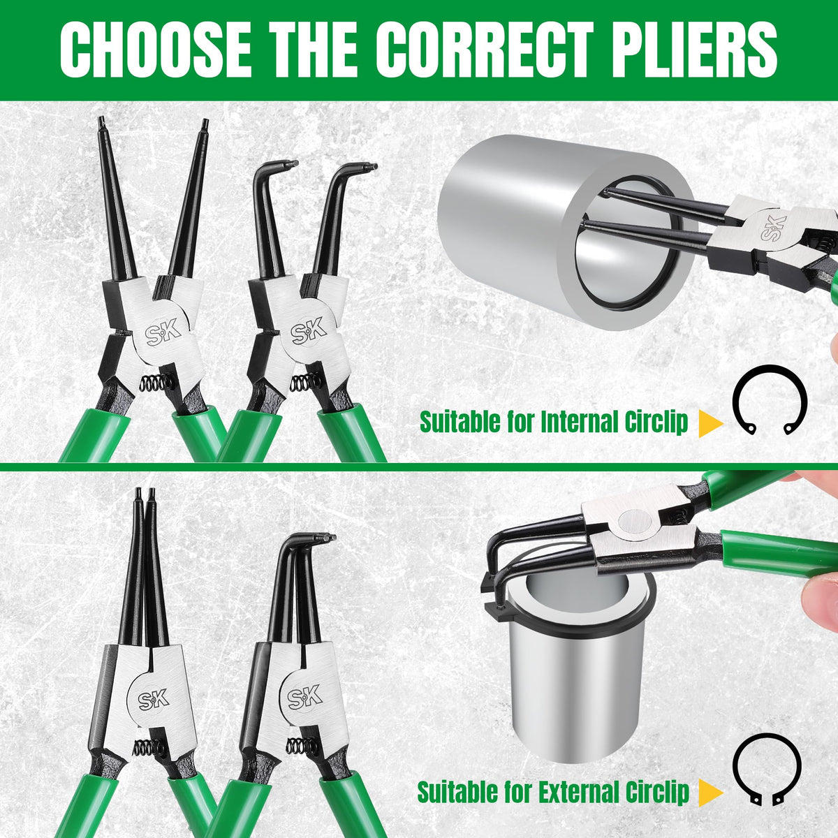 Q: What types of snap ring pliers are included in the SK 4-Piece set?A: The SK 4-Piece Snap Ring Pliers Set includes straight internal pliers, 90-degree angled internal pliers, straight external pliers, and 90-degree angled external pliers, providing versatility for various tasks.