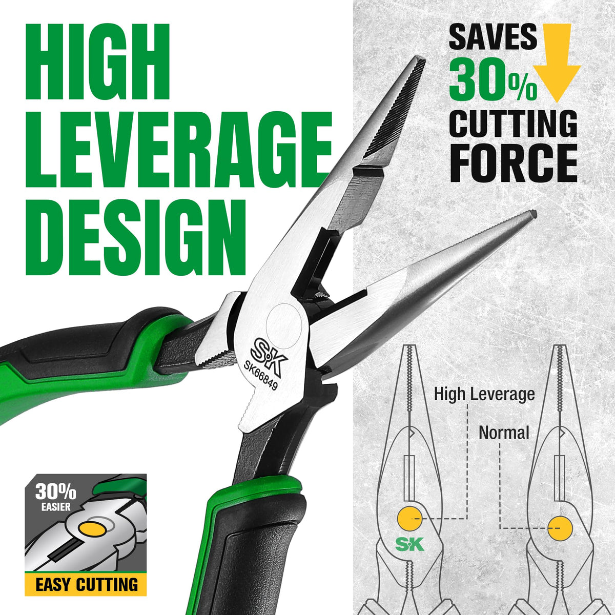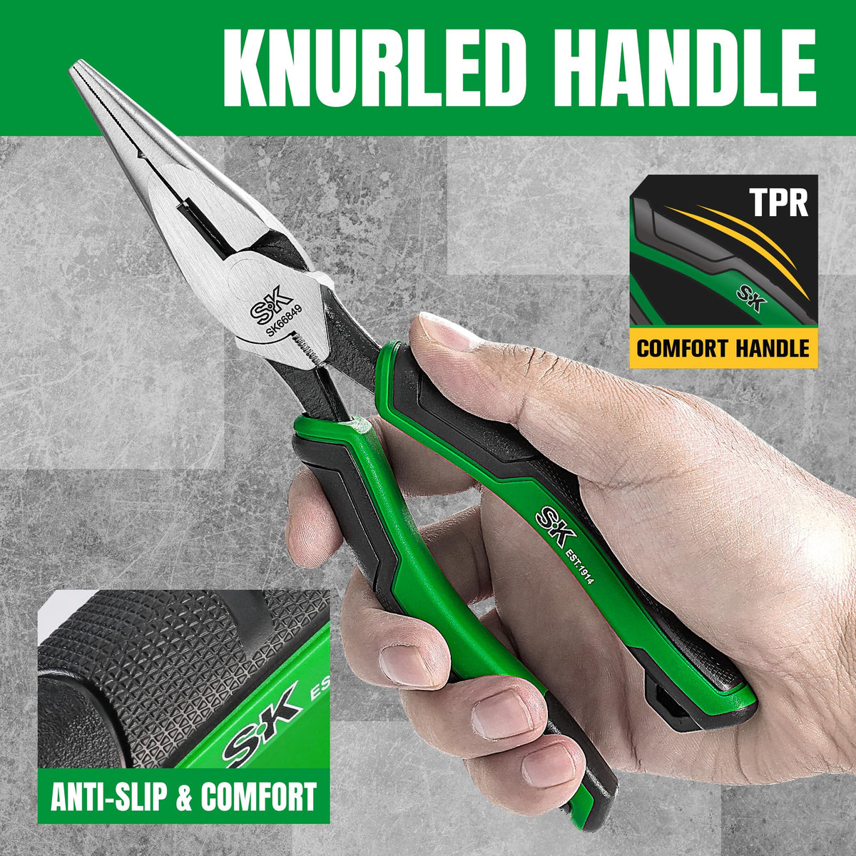 Long Nose pliers perform best in applications where space and reach are a challenge. Uses include: fastening, clamping, winding and cutting. Laser hardened cutting edges deliver superior cutting performance on steel, iron and copper wire | Made of premium CR-V steel, heat treated to achieve both strength and ductility. Enough strength to withstand pressure without deformation for long-lasting service | Ergonomic, Non-slip grips are designed to fit the curve of the palm to reduce hand fatigue and provide secure grip when working | Serrated jaws result in even contact when gripping in any direction for a strong bite to easily and effectively clamp wires, fix or loosen screws and nuts | SK manufactures a wide range of hand tools, including socket sets, wrenches, screwdrivers, pliers, and more, continuing its dedication to provide high-quality products for professionals