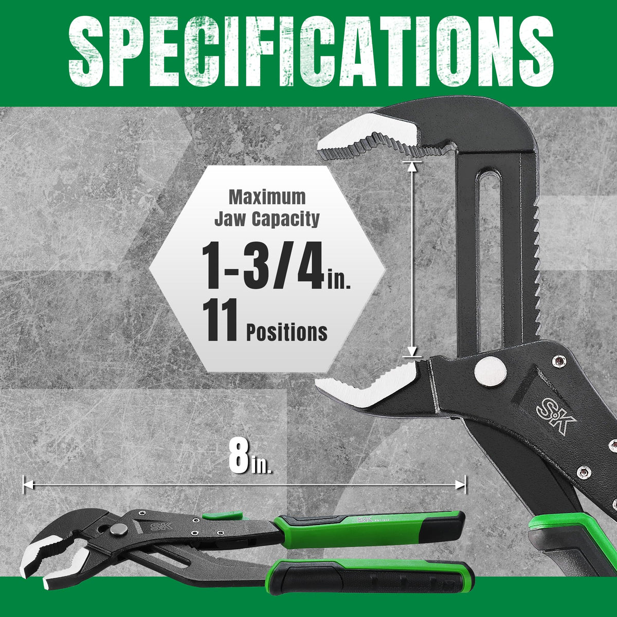 Q: What are the main features of the SK 8-Inch Quick Adjust Groove Joint Pliers?A: The SK 8-Inch Quick Adjust Groove Joint Pliers feature premium CR-V steel construction with a black oxide finish for enhanced anti-rust performance. They have a heat-treated design for strength and ductility, an ergonomic V-JAW design for a strong grip, and a one-hand operation mechanism that allows for quick adjustments with 11 positions and a jaw capacity of up to 1-3/4 inches.