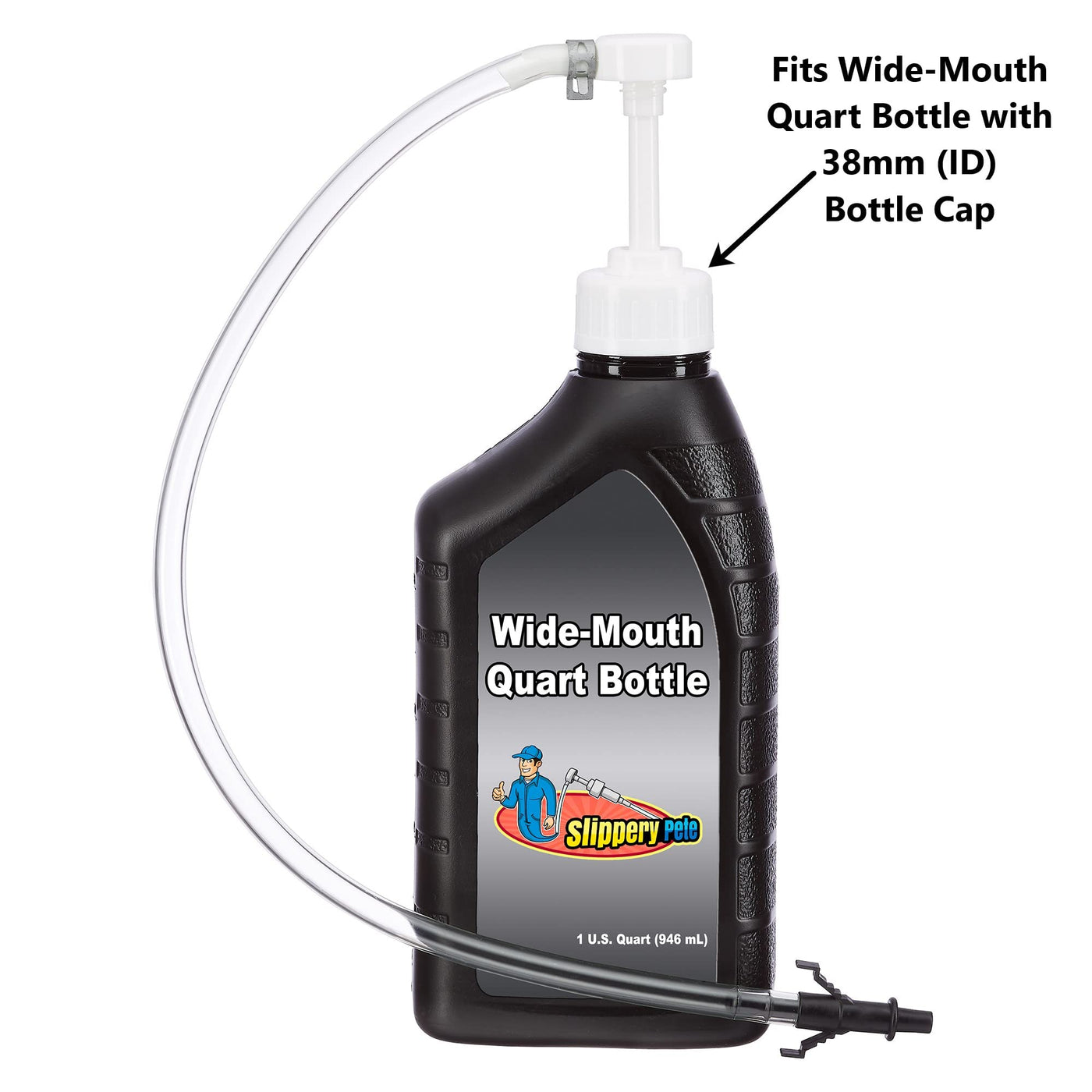 Q: What types of bottles are compatible with the Slippery Pete Fluid Pump?A: The Slippery Pete Fluid Pump is designed to fit standard quart bottles with a 38mm cap. It is important to note that it will not fit Red Line or wide-mouth quart bottles. However, it is compatible with gallon bottles that have a 38mm cap.