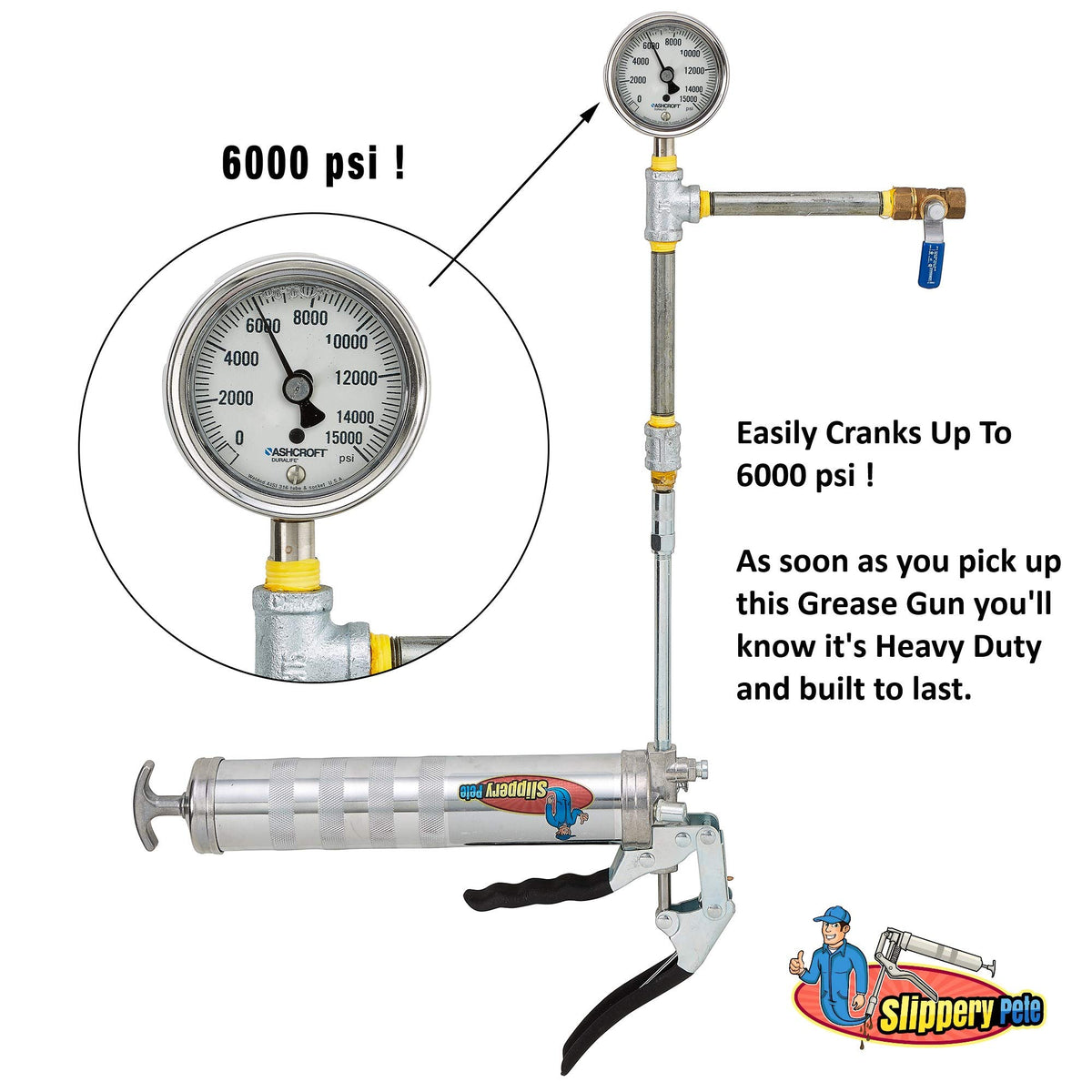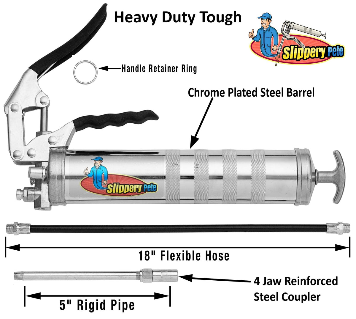 Q: What materials are used in the construction of the Slippery Pete Grease Gun?A: The Slippery Pete Grease Gun is made of heavy-duty steel, ensuring durability and longevity. This material choice provides robust construction for reliable performance, even under demanding conditions.