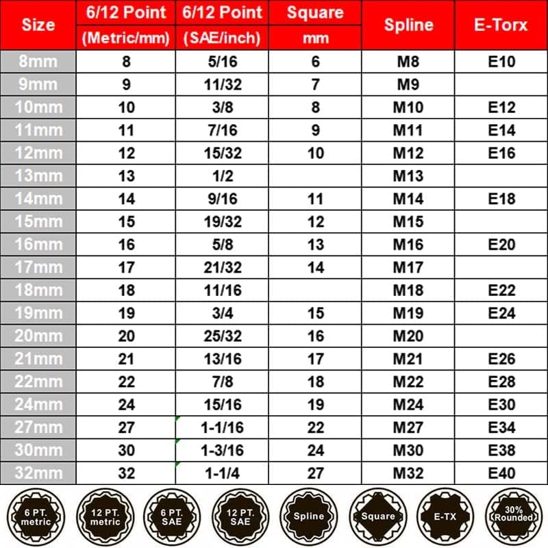 Q: What sizes are included in the Spline Socket Set?A: This set includes 19 pieces with spline sockets ranging from 8mm to 32mm, suitable for various fasteners including 6 points, 12 points, E-torx, triangle, and square types.
