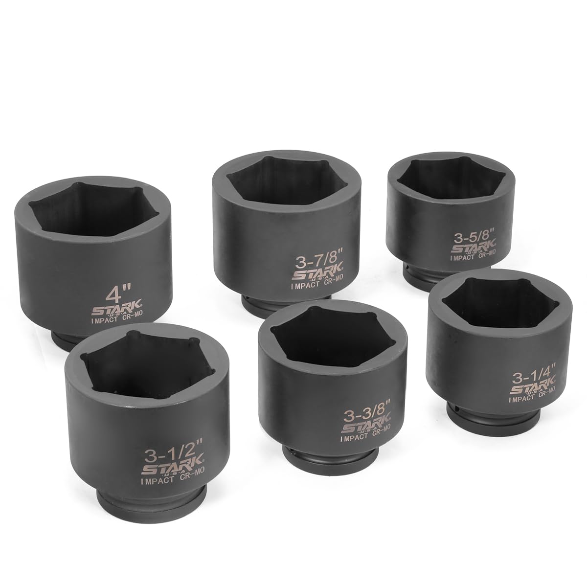 Stark USA 1' Drive Jumbo Shallow Impact Socket Set Spindle Axle SAE Sockets 6-Piece (3-1/4' - 4') Cr-Mo Steel Removing And Installing Axle Nuts