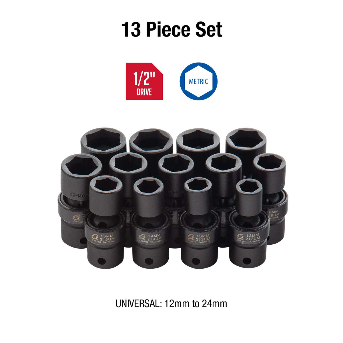 This Sunex 1/2 inch drive universal 13 piece metric impact socket set includes the most common sizes used for automotive repair. It includes 13 metric sockets. It is made of CR-MO alloy steel for long life. It is fully guaranteed and includes a heavy duty blow molded storage case.