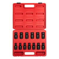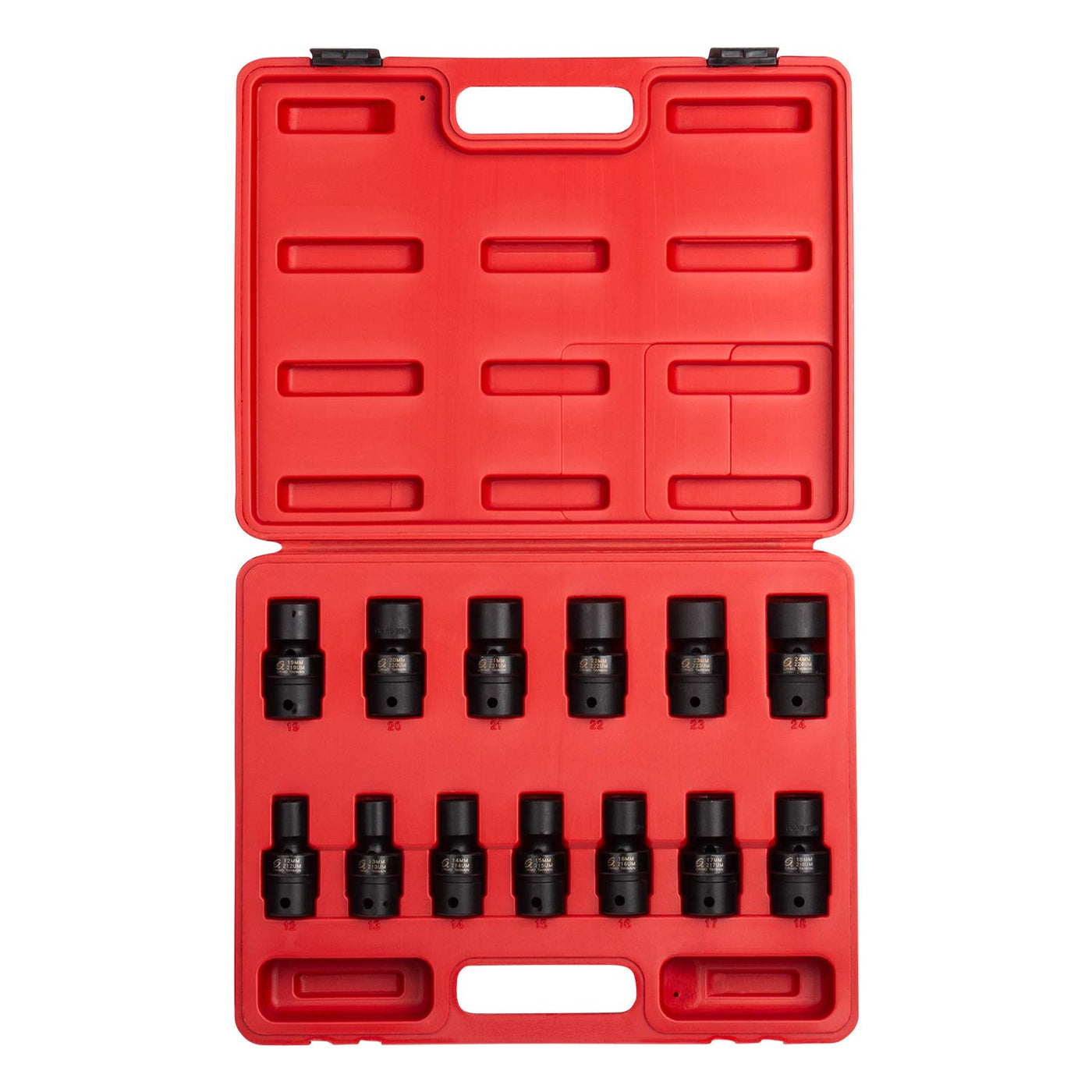 Q: What sizes are included in the SUNEX TOOLS 1/2 Inch Drive Universal Impact Socket Set?A: The SUNEX TOOLS 1/2 Inch Drive Universal Impact Socket Set includes 13 metric sockets ranging from 12mm to 24mm, making it ideal for various automotive repair tasks.