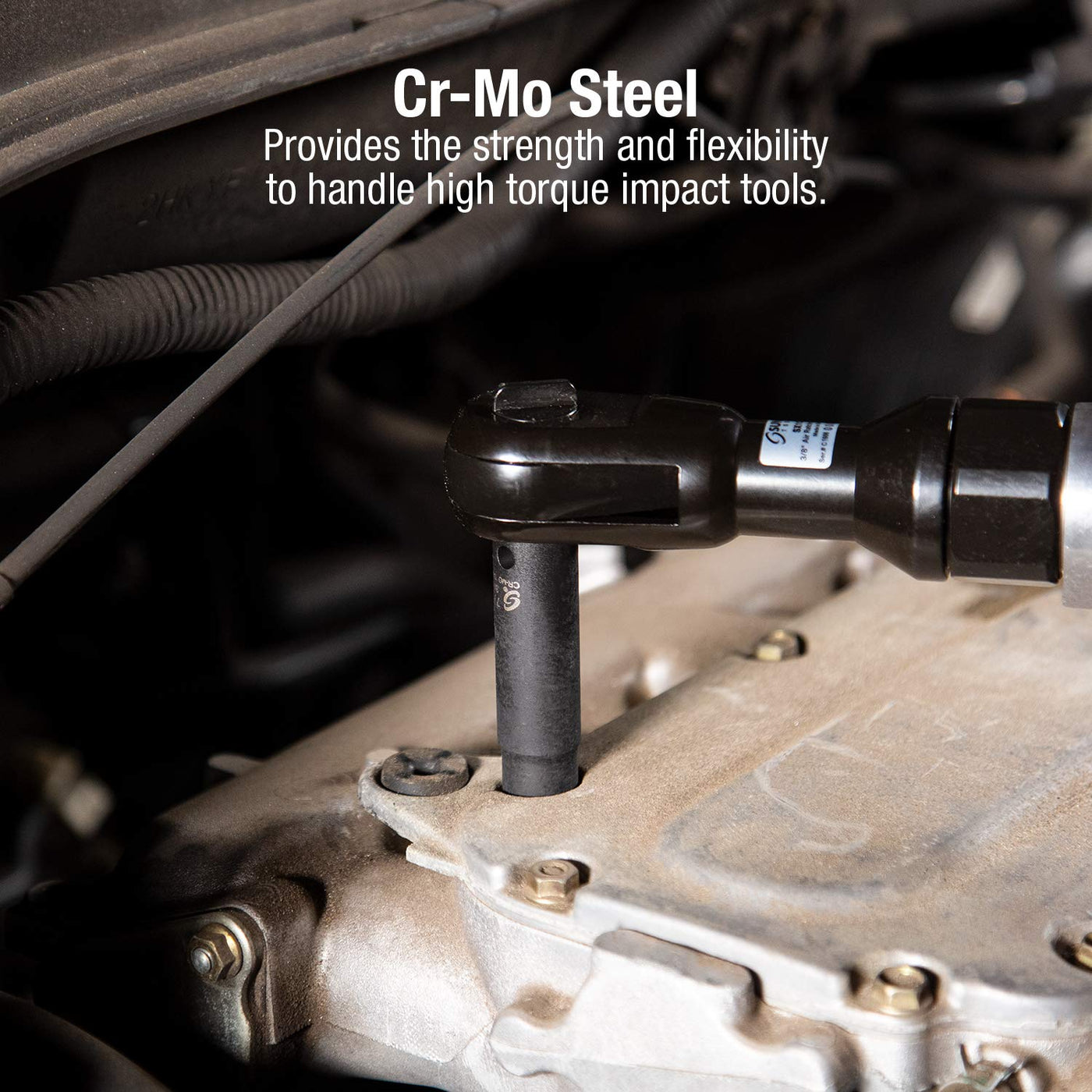 Q: What material is used for the sockets in this set?A: The sockets in the Sunex 3330 set are made from Chrome Molybdenum Steel (CR-MO), which offers exceptional strength and flexibility, making them ideal for high torque impact tools.