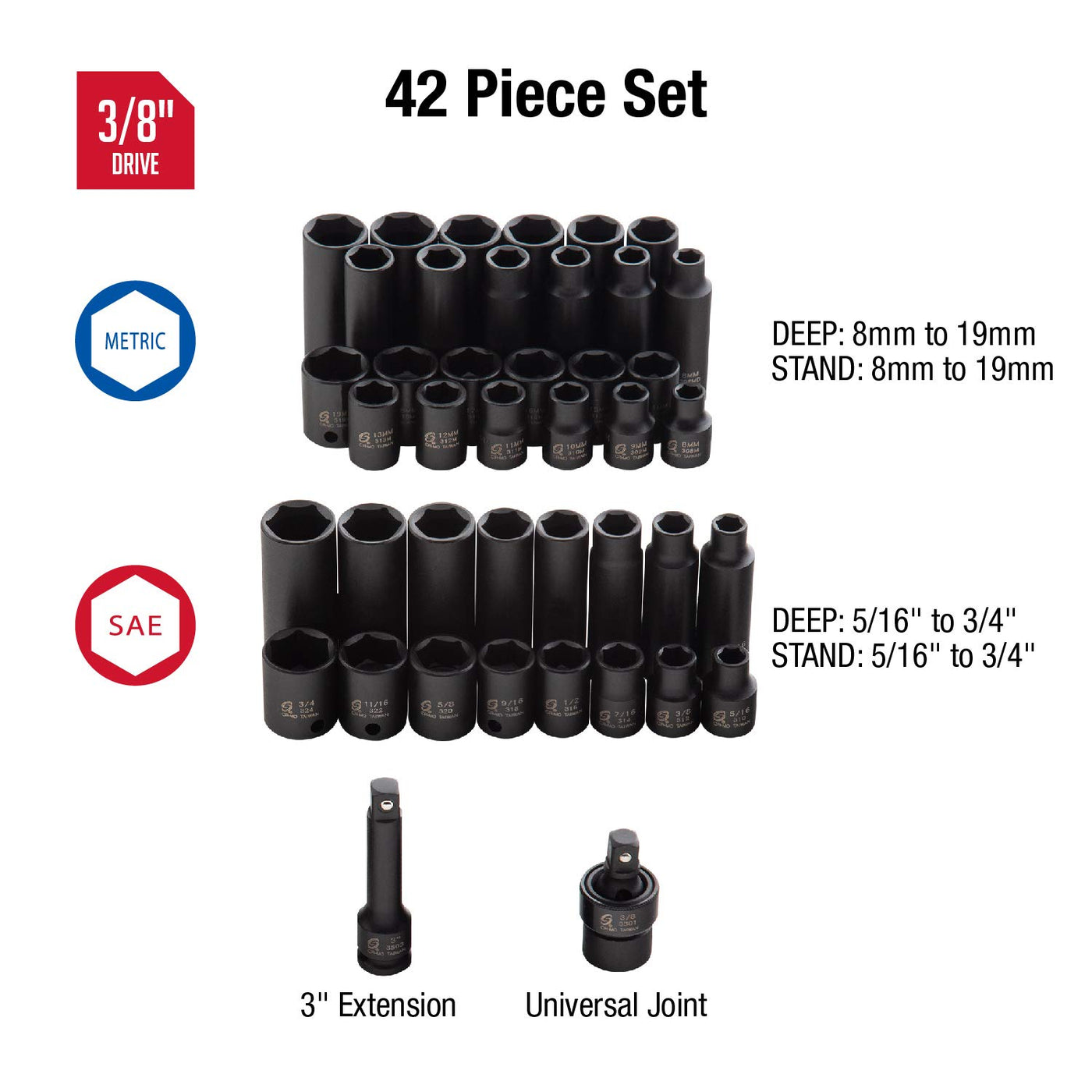 The Sunex 3342 3/8” drive Master impact socket set includes SAE sizes from 5/16” to 3/4” and metric sizes from 10mm to 19mm in both standard and deep lengths. It also includes a Universal joint and a 3” extension. Each socket has been forged from CR-MO alloy steel, Designed with radius corner, Made with chamfered openings, and marked by both laser etching and roll stamping to ensure permanent socket identification. All of this ensures our sockets’ professional-level performance-convenientlyy stored in one heavy duty Storage case. Meets ANSI standards.