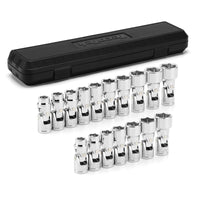 The TecoTek 3/8-Inch Drive Universal Joint Socket Set is constructed from premium Heat Treated Chrome Vanadium Steel and feature a corrosion resistant mirror polish finish, which ensures longevity even in demanding work environments. The 3/8' drive swivel socket set metric features a full 360 rotation motion with 40 degree working angle. Flexible design allows for easier access to fasteners in tight or hard-to-reach spaces.