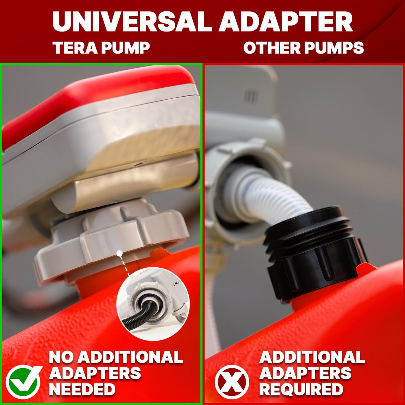 Introducing our automatic battery powered fuel transfer pump. Our new universal adapter is built to be versatile and fits on most North American plastic fuel cans; no more need for multiple adapters. Efficient and effective with a flow rate of 2.5 gallons per minute, just press the on button to turn on the pump. Compatible with various liquids such as gasoline, diesel, kerosene and more. The 51.2 hose lets you siphon liquids from a distance, allowing you to leave your gas can on the ground and freeing your hands.