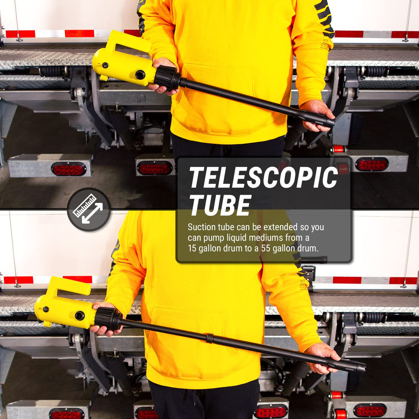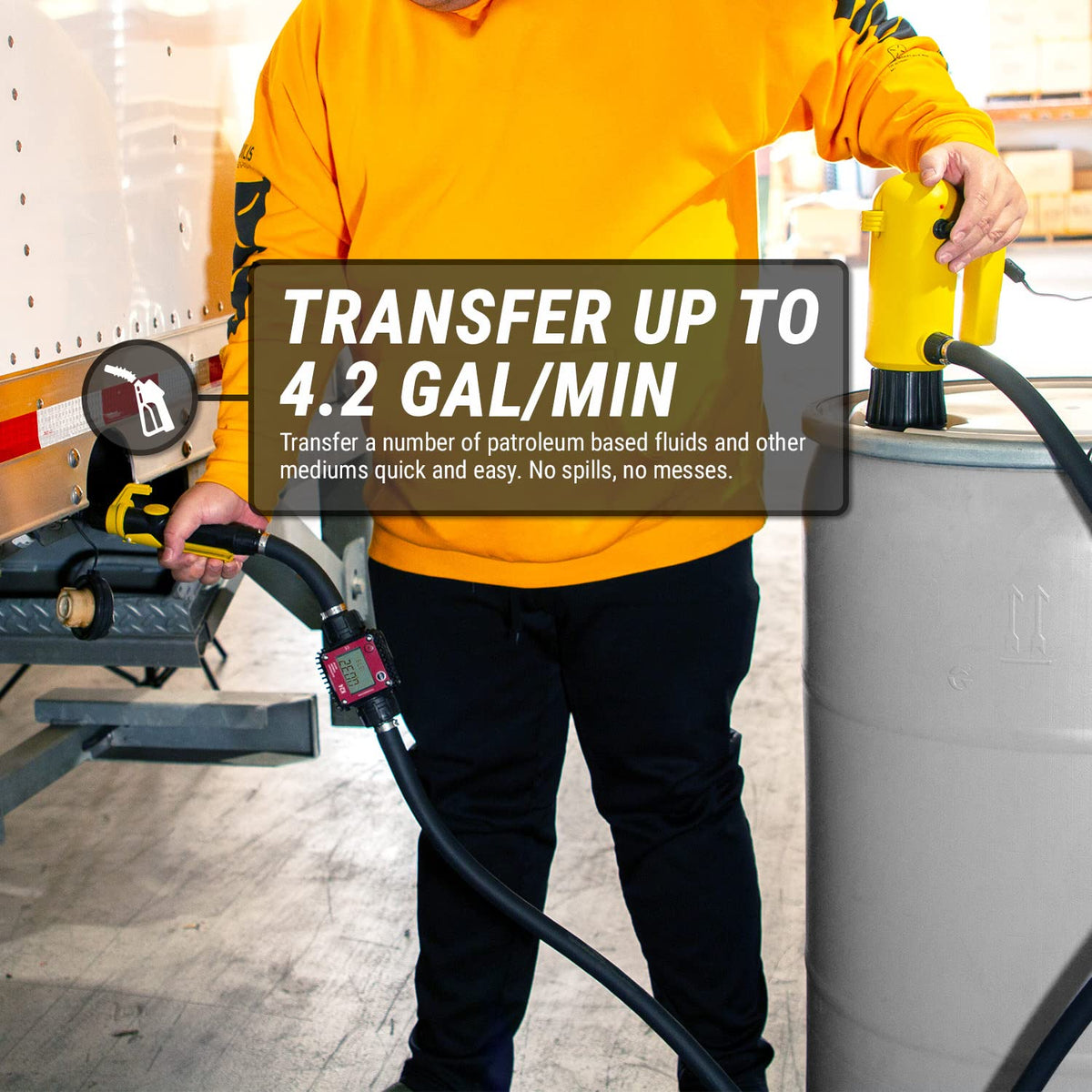 The TERA PUMP - TReDRUME-M Plug-In Electric Pump is the perfect tool for anyone who needs to transfer gasoline, diesel, DEF, kerosene, or AG chemicals quickly and efficiently. With a pumping capacity of 4.2 gallons per minute, this pump can quickly and easily transfer fuel from your drums into your vehicle or equipment. The powerful motor and telescopic intake tube allow you to easily reach the bottom of your 15, 30, or 55-gallon drum, making fuel transfer a breeze.