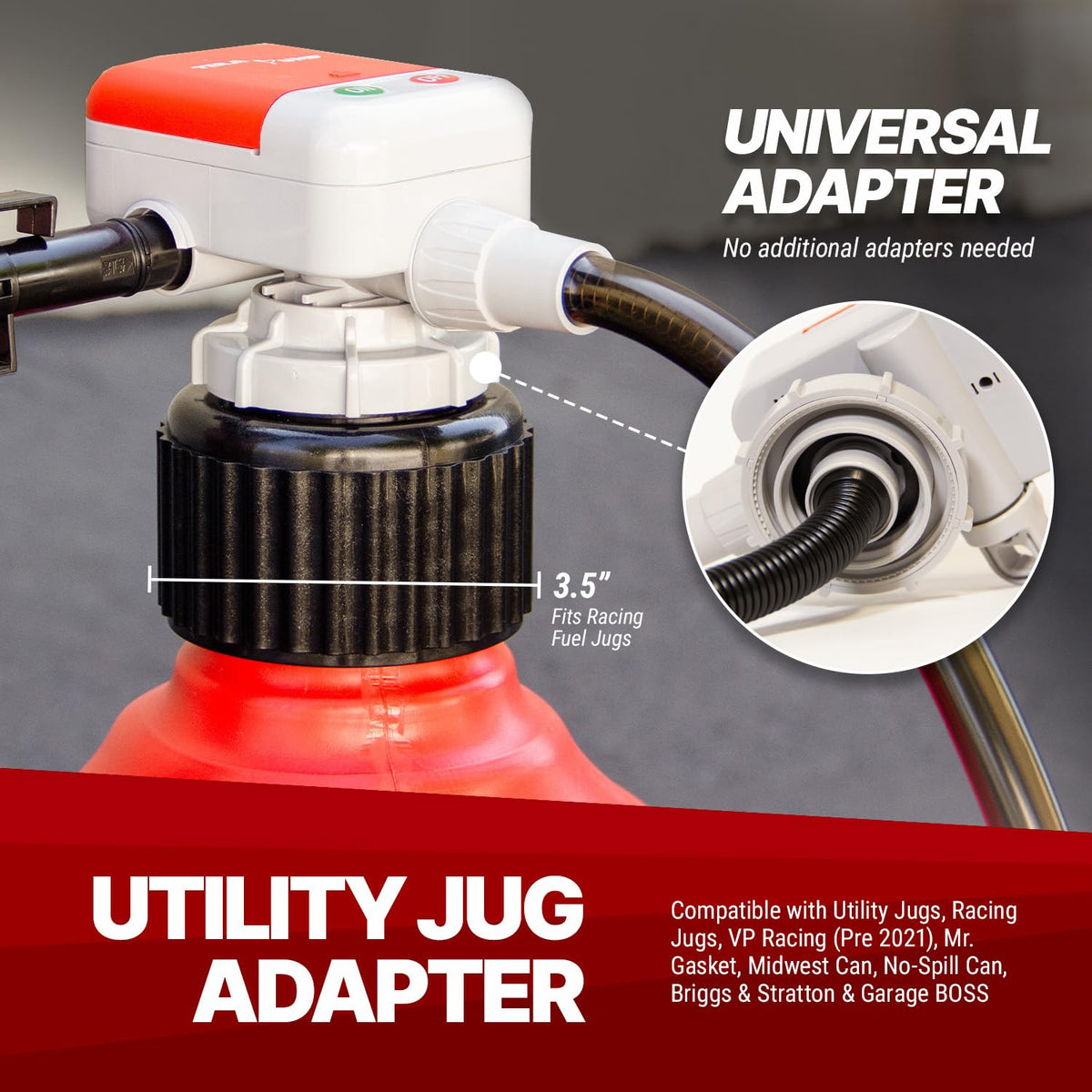 Q: Is the TERA PUMP TRFA01-XL compatible with different gas can sizes?A: Yes, the TERA PUMP TRFA01-XL is compatible with numerous gas cans thanks to the four included adapters suitable for various sizes, including a Racing Can and adapters for 3 to 5-gallon cans.