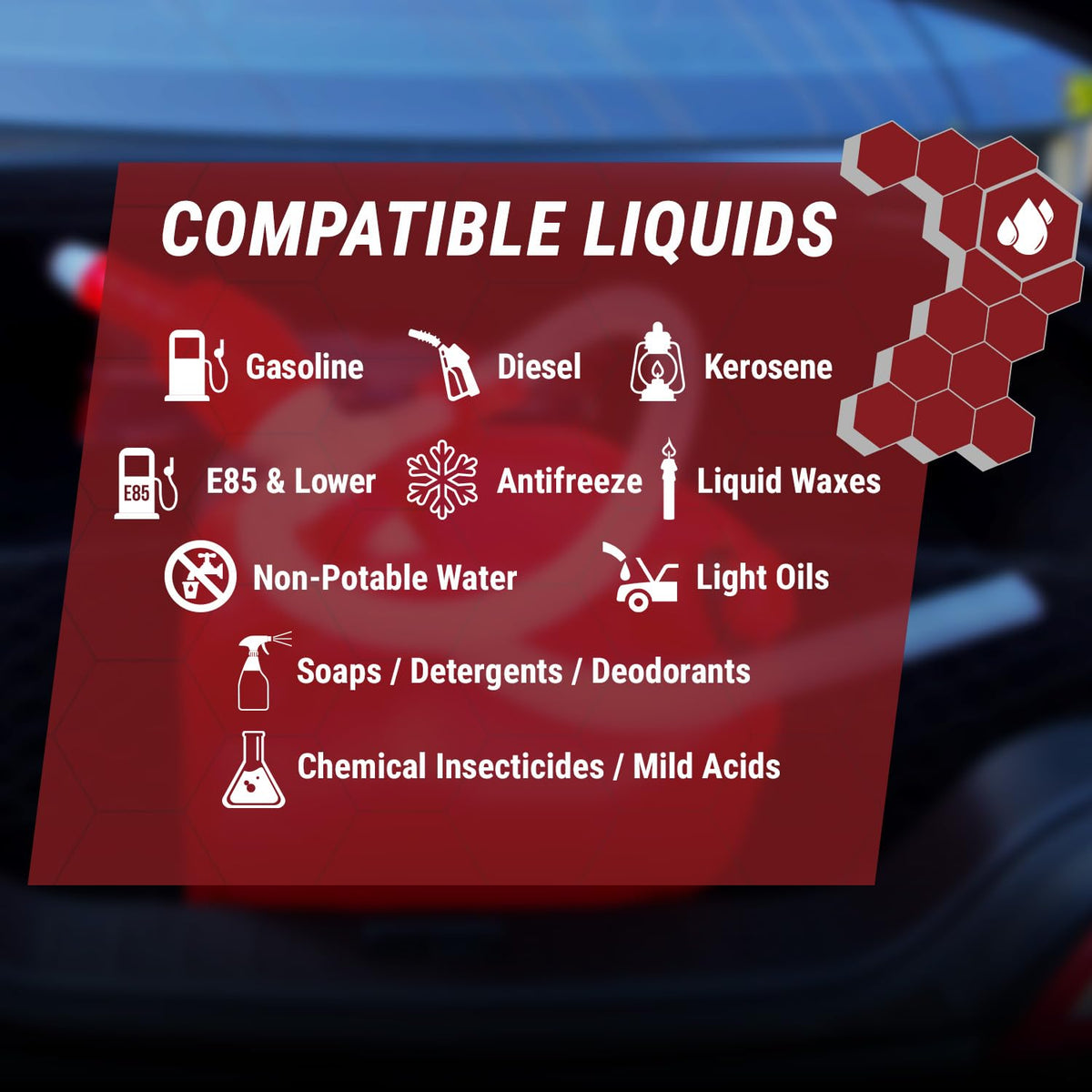 Q: What types of liquids can the TERA PUMP TRM20 transfer?A: The TERA PUMP TRM20 is designed to transfer a variety of non-potable liquids including gasoline, diesel, anti-freeze, light oil, cleansers, chemical insecticides, cleansing agents, deodorizers, gentle acids, and wax. However, it is not recommended to store the pump with E85 fuel for long periods.