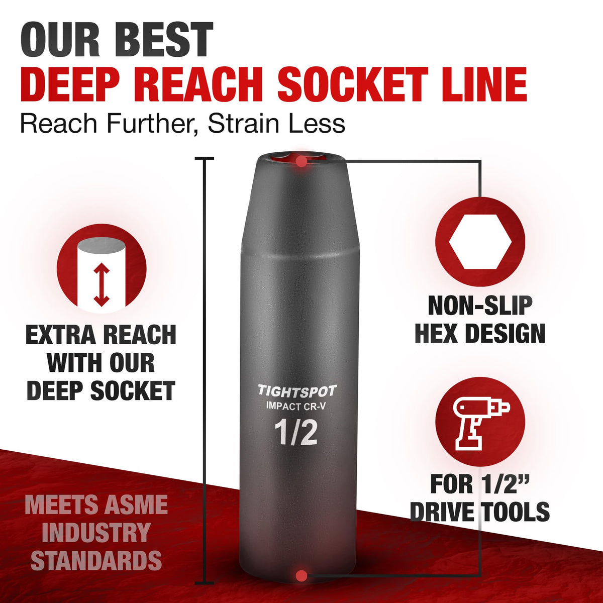 Tightspot 1/2 Inch Drive - 1/2 Inch Deep Impact Socket With Anti-Rounding 6 Point Design, Heat-Treated Crv Steel