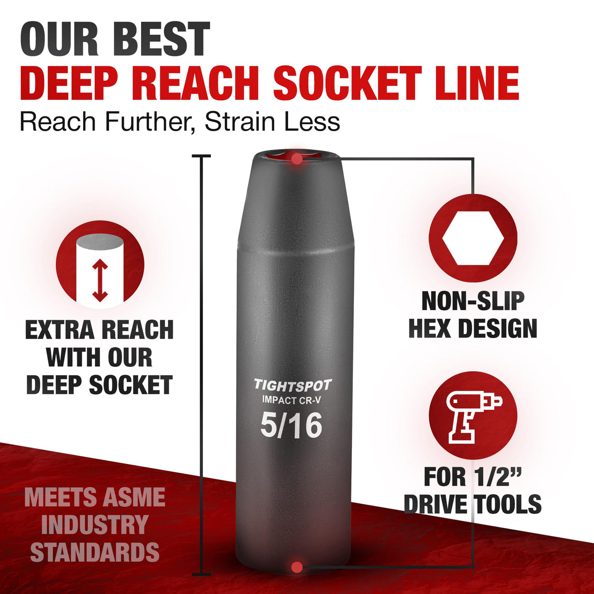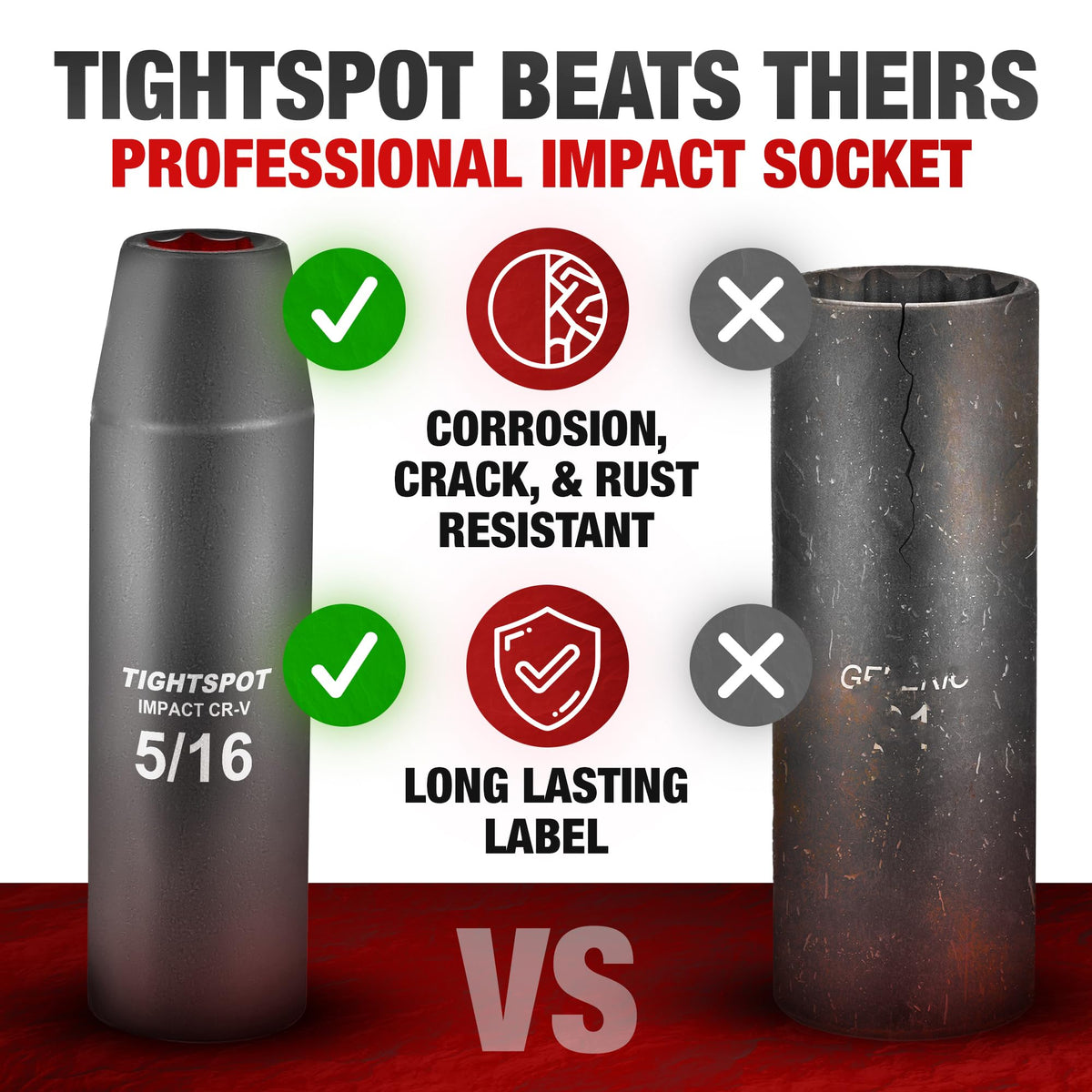 Tightspot 1/2 Inch Drive - 5/16 Inch Deep Impact Socket With Anti-Rounding 6 Point Design, Heat-Treated Crv Steel