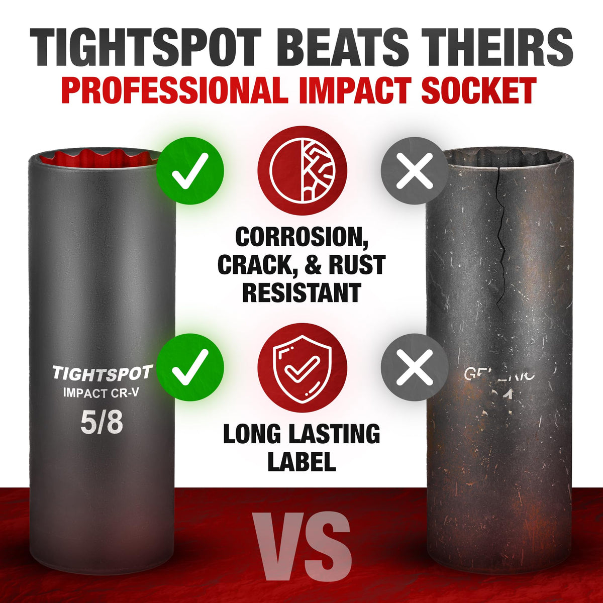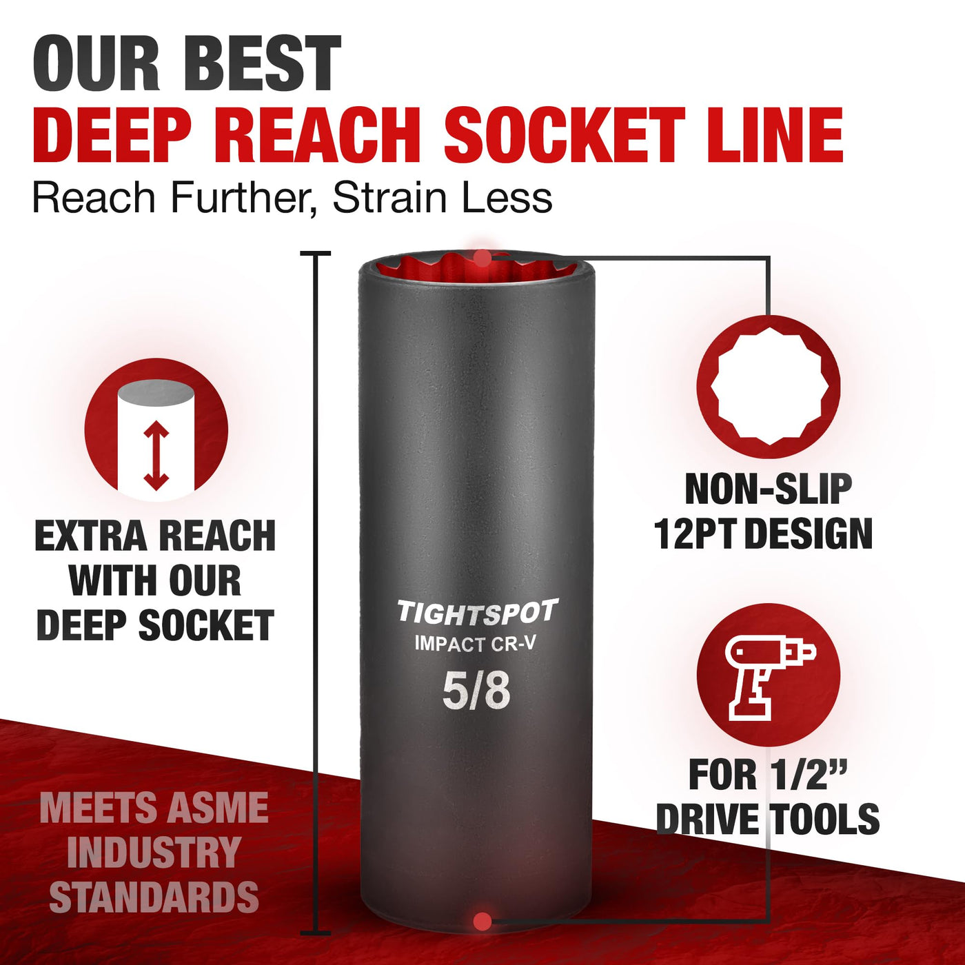 Tightspot 1/2 Inch Drive - 5/8 Inch Deep Impact Socket With Anti-Rounding 12 Point Design, Heat-Treated Crv Steel
