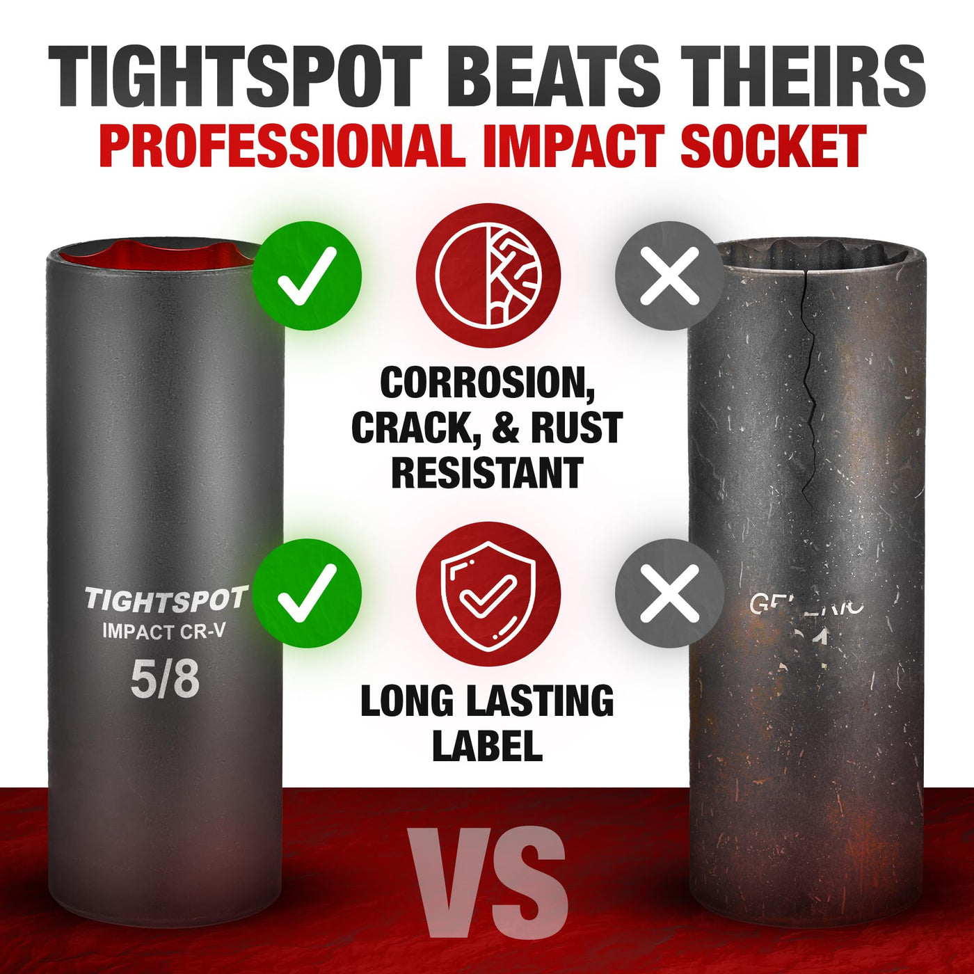 Tightspot 1/2 Inch Drive - 5/8 Inch Deep Impact Socket With Anti-Rounding 6 Point Design, Heat-Treated Crv Steel