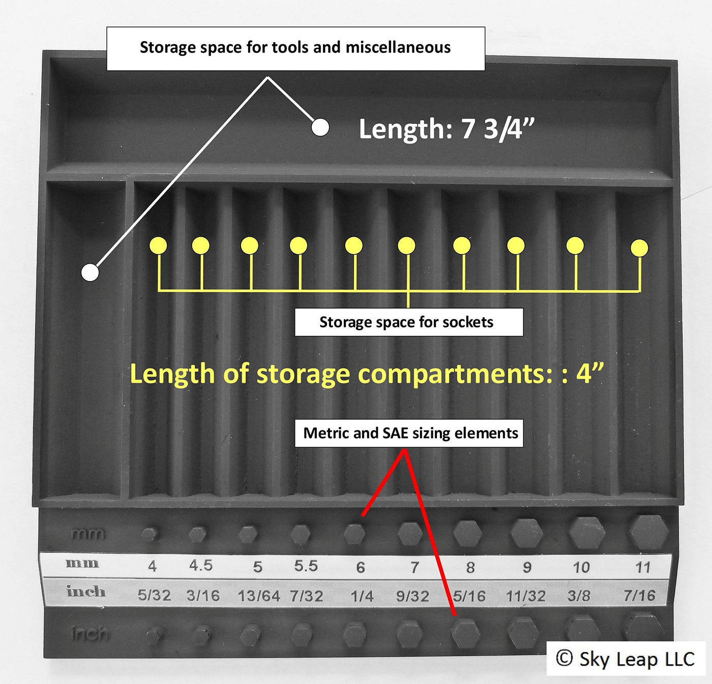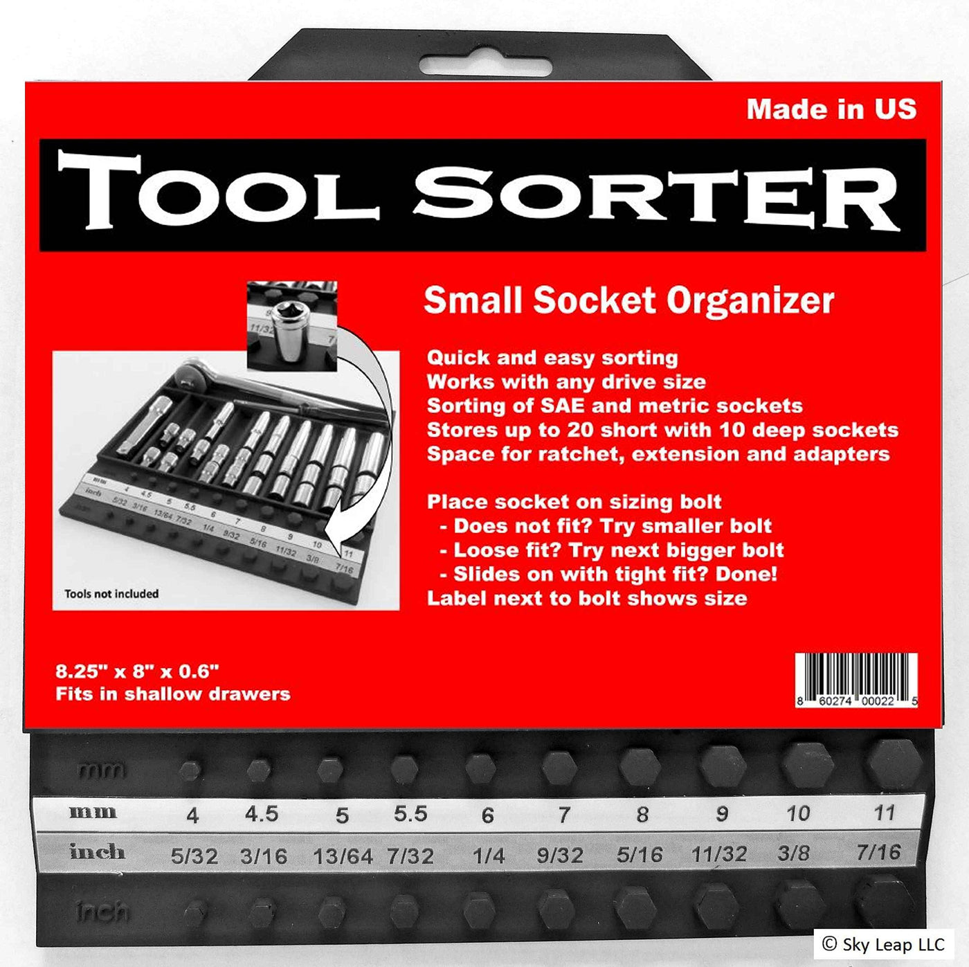 This Small Socket Organizer Offers An Easy And Convenient Solution To Sorting And Storing Your Small Sockets, Regardless Of Drive Size. **** No More Squinting: Sizing Bolts With Easy-To-Read Labels Help You Quickly Identify The Size Of Sockets. This Organizer Measures The Size Of Sockets Inside The Tool, So All Makes And Brands Can Be Sized. **** Socket Sizing: Place Socket On Sorting Bolt - Doesnt Fit? Try The Next Smaller Bolt. Loose Fit? Try Next Bigger Bolt. Slides On With Snug Fit? You Got It! **** Fits Almost Any Drawer: Socket Organizer Has A Very Low Profile With Sockets Stored On Their Side. The Organizer Measures Only 7.9 X 8.25'' X 0.6'' After Removal Of The Packaging Hanger And Is Large Enough To Hold Up To 20 Short And 10 Long Sockets. Storage Compartments Are 4'' Long -- So The Total Number Of Sockets Depends On The Mix Of Long And Short Sockets. Please Measure Your Tools To Determine How Many Sockets Can Be Stored For Your Specific Sets. ***** -> Please Note That Sockets Are Not Held In Place With Clips In This Organizer. The Tray Is Portable To Get Your Tools To Wherever You Need Them, But Sockets Will Fall Out If You Turn The Organizer Upside Down. We Have Checked The Sorting Studs For A Variety Of Brands And Have Not Come Across Socket Sets That Don'T Fit. However, Given The Variations Of Tools Available, If You Come Across Brands/Types That Don'T Fit Please Let Us Know So We Can Update This Listing.
