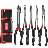 Q: What is the size and configuration of the pliers in this set?A: The set includes 5 pieces of pliers, each measuring 11 inches in length. It features a Long Reach Straight Plier, a 90° Bent Nose Plier, a 45° Bent Nose Plier, a Diagonal Plier, and an O-shape Nose Plier.