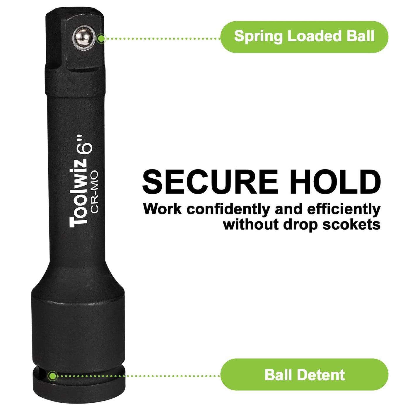 Q: How does the spring-loaded ball feature enhance the usability of the extension bar?A: The spring-loaded ball at the male end of the Toolwiz extension bar securely retains sockets to prevent them from dropping, while the ball hole at the drive end locks onto the drive tang of impact tools for added convenience.