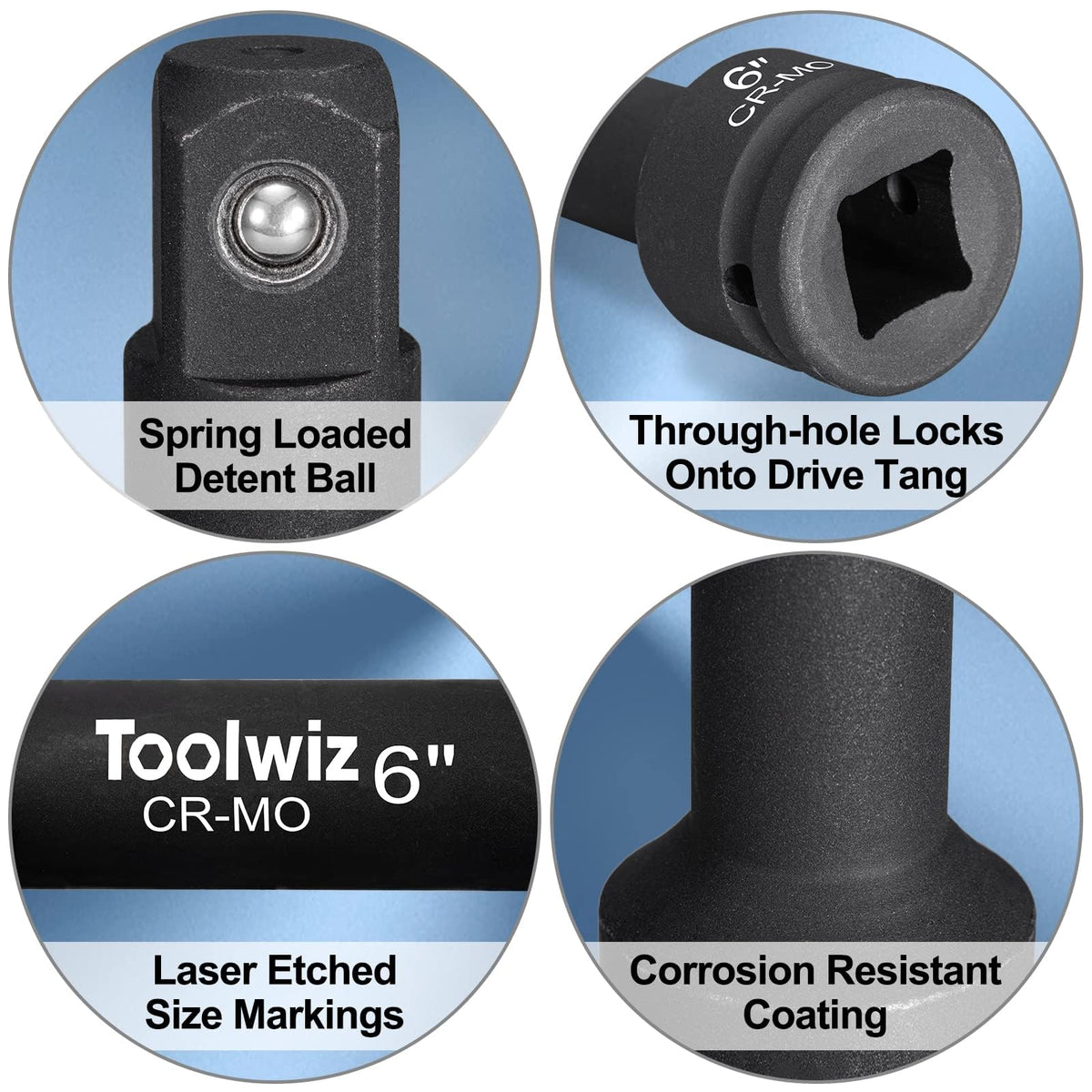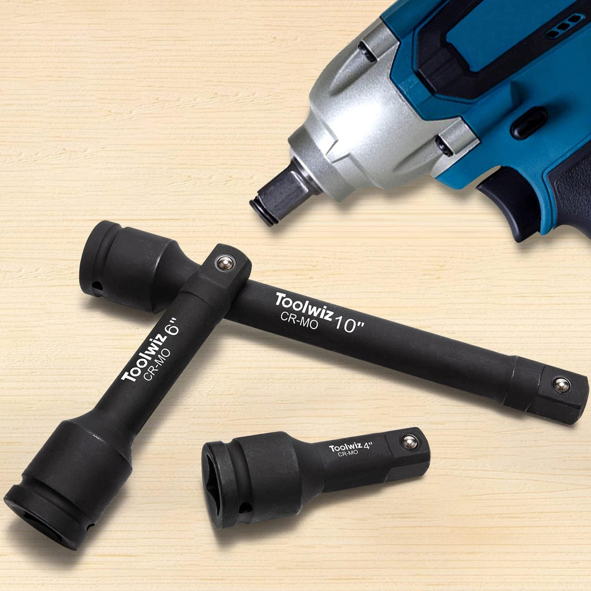3/4” Drive Impact Extension Bar, Cr-Mo Steel ,3-Piece Set , 4”, 6”, 10” ext. bar by Toolwiz Toolwiz 3/4-in Drive impact extension bar gives your impact wrench and sockets the extra length needed to work in hard-to-reach spots. Drive Impact Extension Set. Engineered for use with impact drivers, they reach past obstructions or into tight, narrow spaces and deliver the torque needed to break loose stubborn fasteners. It gives you the flexibility to get the job done easier and faster. Ideal DIY tool for car mechanics and a must have tool for repair shops