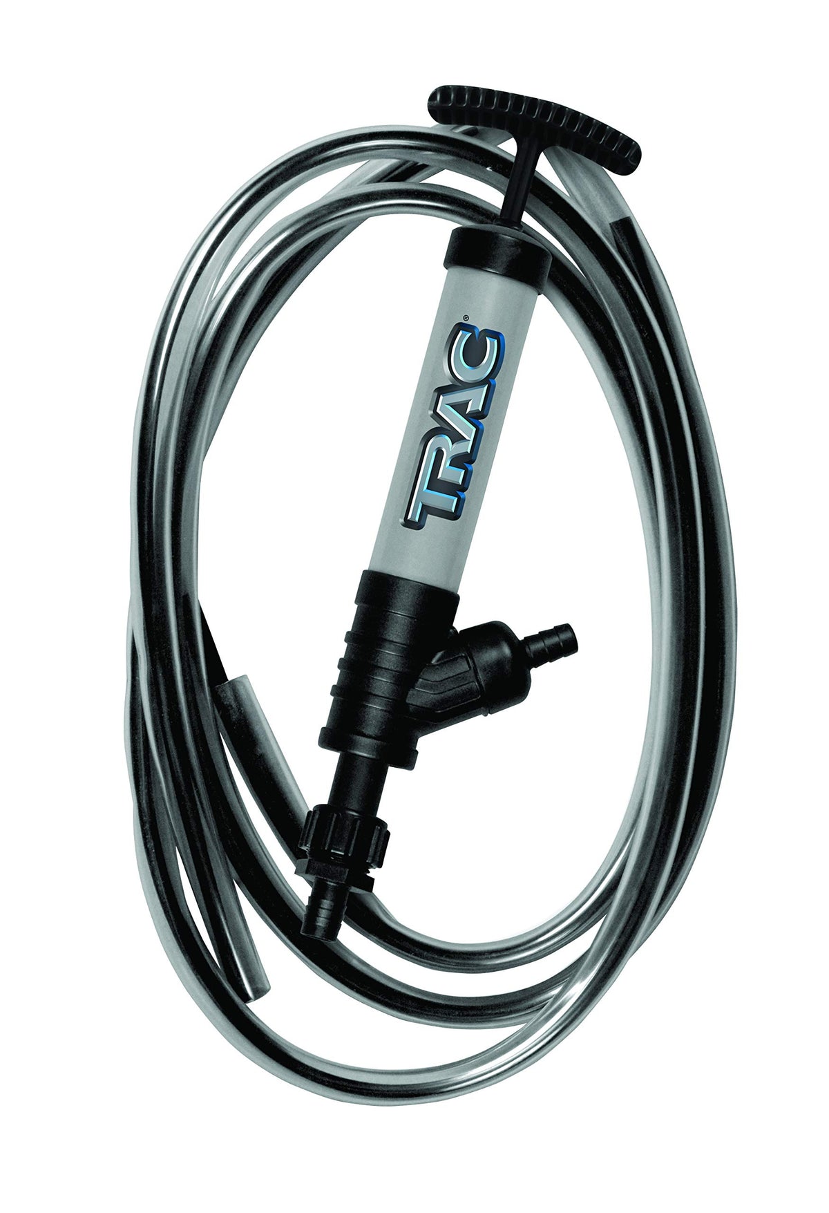 Q: How do I use the Trac Outdoors Hand Held Fluid Extractor?A: To use the fluid extractor, simply connect the appropriate hose to the extractor, place the other end into the fluid you wish to remove, and pump the handle to create a vacuum that will extract the fluid into your chosen container.