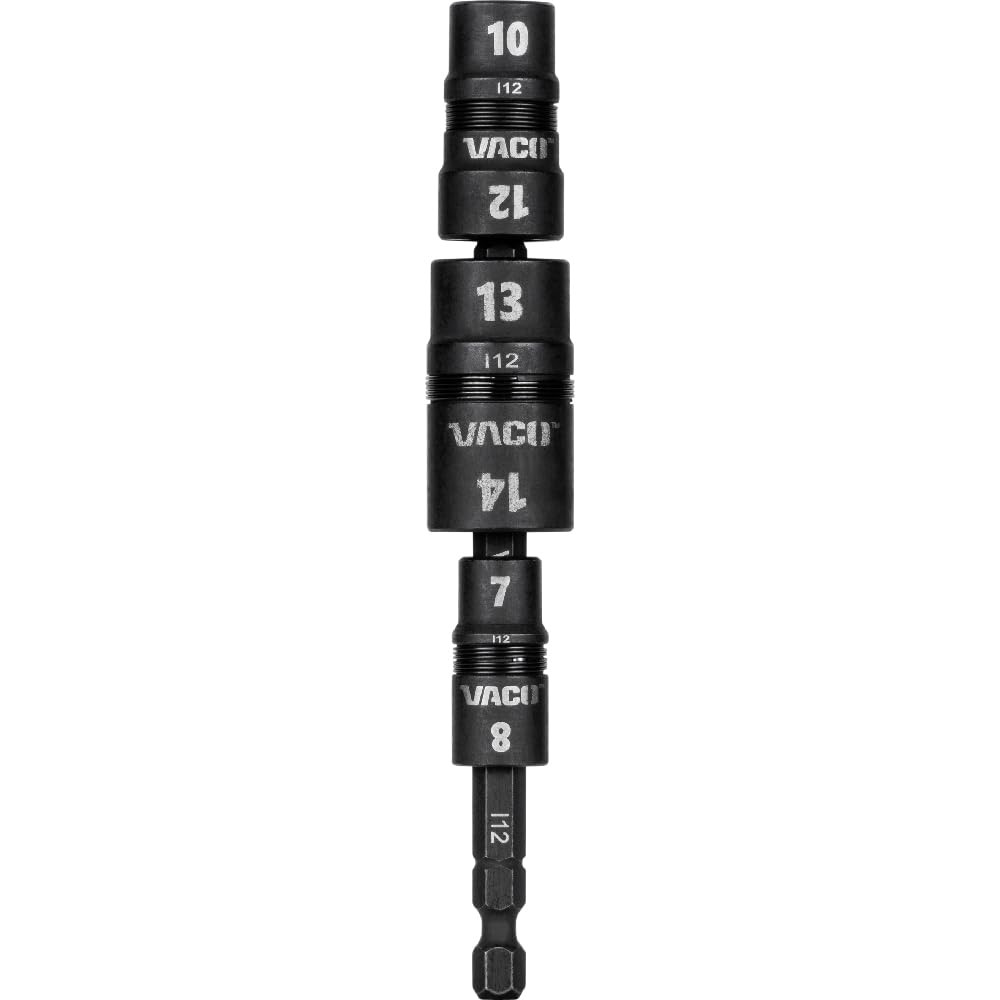 Q: What sizes of hex sockets are included in the VACO VAC1071 Impact Driver set?A: The VACO VAC1071 Impact Driver set includes six different metric hex sizes: 7mm, 8mm, 10mm, 12mm, 13mm, and 14mm, all conveniently offered in just three reversible flip sockets.