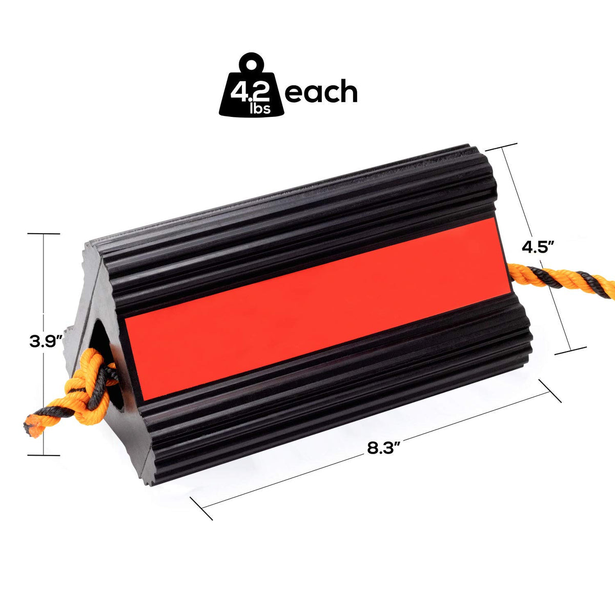 Each individual chock measures 8.3” x 4.5” x 3.9” in size and weighs 4.2lbs, making them easy to place and pick up again. On top of that, each chock has a red stripe across it to increase visibility.