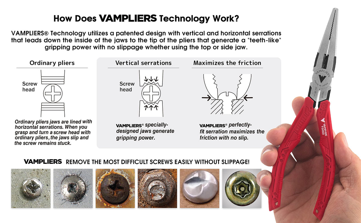 Vampire Tools delivers Professional Grade Performance Tools fit to match the needs of Electricians, Auto/Aviation Mechanics, Construction Workers and Tradesman Worldwide. | Long Nose Stripped Screw Removal Tool specially designed for extracting small-sized stripped/damaged/rusted/stuck screws and stubborn fasteners in confined areas, hard to reach spaces. Remove tiny specialty screws such as Security, Dome, Truss, Torx or Pan head screws sized: dia. 0.08" to 0.22" (dia. 2 to 5.5mm). | Full Length: 7.5" (190mm) - Weight: 6.35 oz (180g) - Equipped with intermeshed teeth for gripping/twisting and 12mm long side wire cutter to cut copper and steel wire (dia. 3.2mm) | Jaws/Body made of Premium Japanese High Carbon Steel. Heavy Duty T-shaped Ergonomic Handles made of Thermoplastic Rubber (TPR) for maximum durability and comfort. | Automatic 4-Year Warranty with purhcase | 5-Year Warranty with Product Registration on Vampire Tools website. | Industry Use: Aerospace, Avionics, Automotive Repairs, Electrical, HVAC, Medical Service Field, MRO - Maintenance, Repair and Operations, Home Improvement/DIY