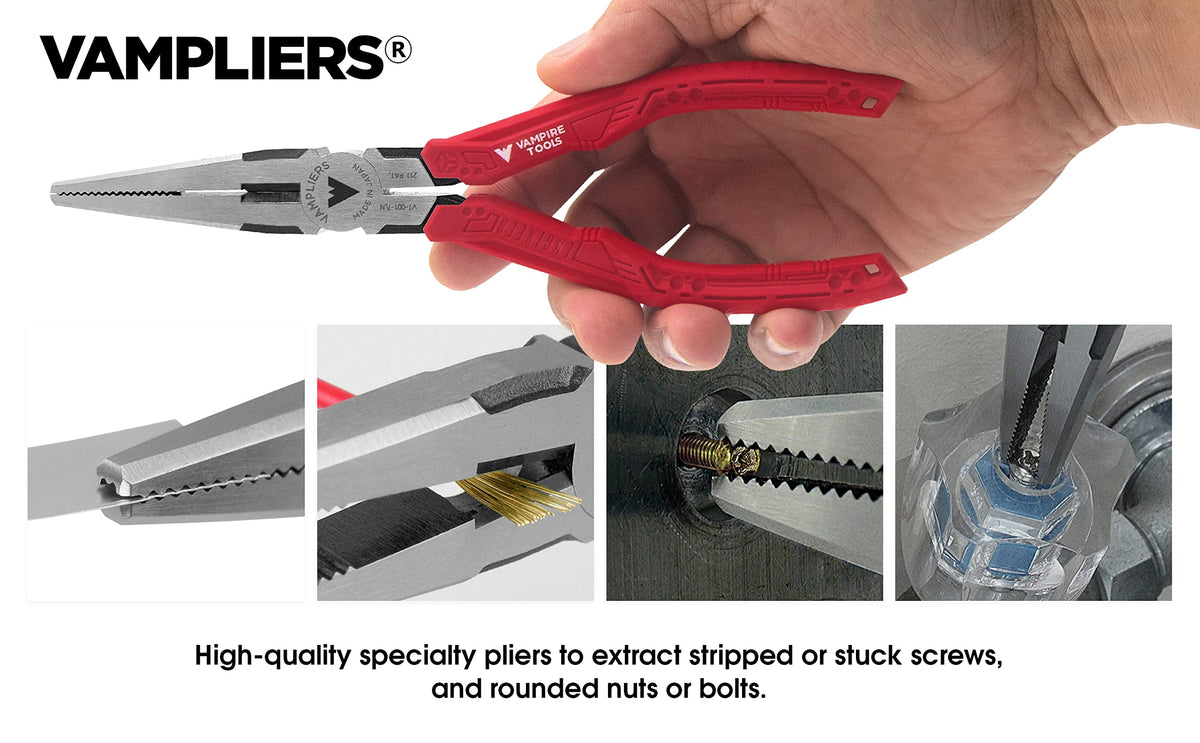 Vampliers 7.5" Stripped Screw Extractor Needle Nose Pliers. Made In Japan. Long Nose Screw Removal Plier With Wire Cutter For Removing Damaged Fasteners In Confined Spaces.