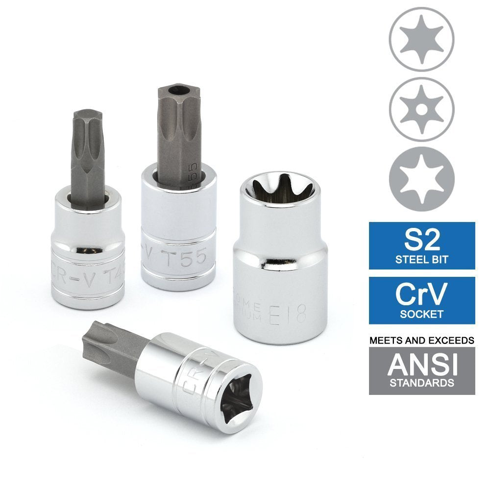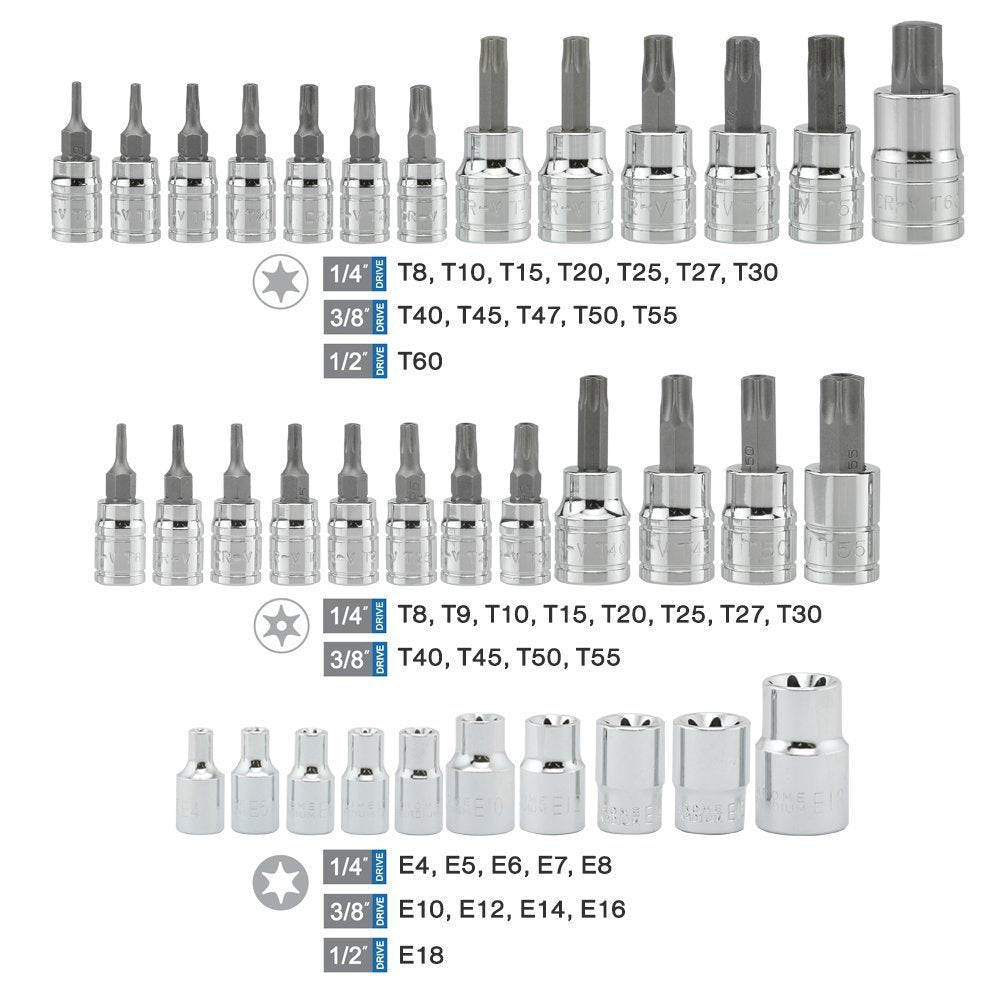 Premium S2 steel bits provide optimal strength and durability to unfasten intractable screws and bit ends are sized for precise fitting. Sockets are made of enduring Chrome-Vanadium. Set Includes: 10-piece Torx E socket: 5-pc. 1/4 in. drive: E4, E5, E6, E7, E8 4-pc. 3/8 in. drive: E10, E12, E14, E16 1-pc. 1/2 in. drive: E18 13-piece Torx Bit Socket: 7-pc. 1/4 in. drive: T8, T10, T15, T20, T25, T27, T30 5-pc. 3/8 in. drive: T40, T45, T47, T50, T55 1-pc. 1/2 in. drive: T60 12-piece Torx Tamper Bit Socket: 8-pc. 1/4 in. drive: TT8H, TT9, TT10, TT15, TT20, TT25, TT27, TT30 4-pc. 3/8 in. drive: TT40, TT45, TT50, TT55 Storage and carrying case included.