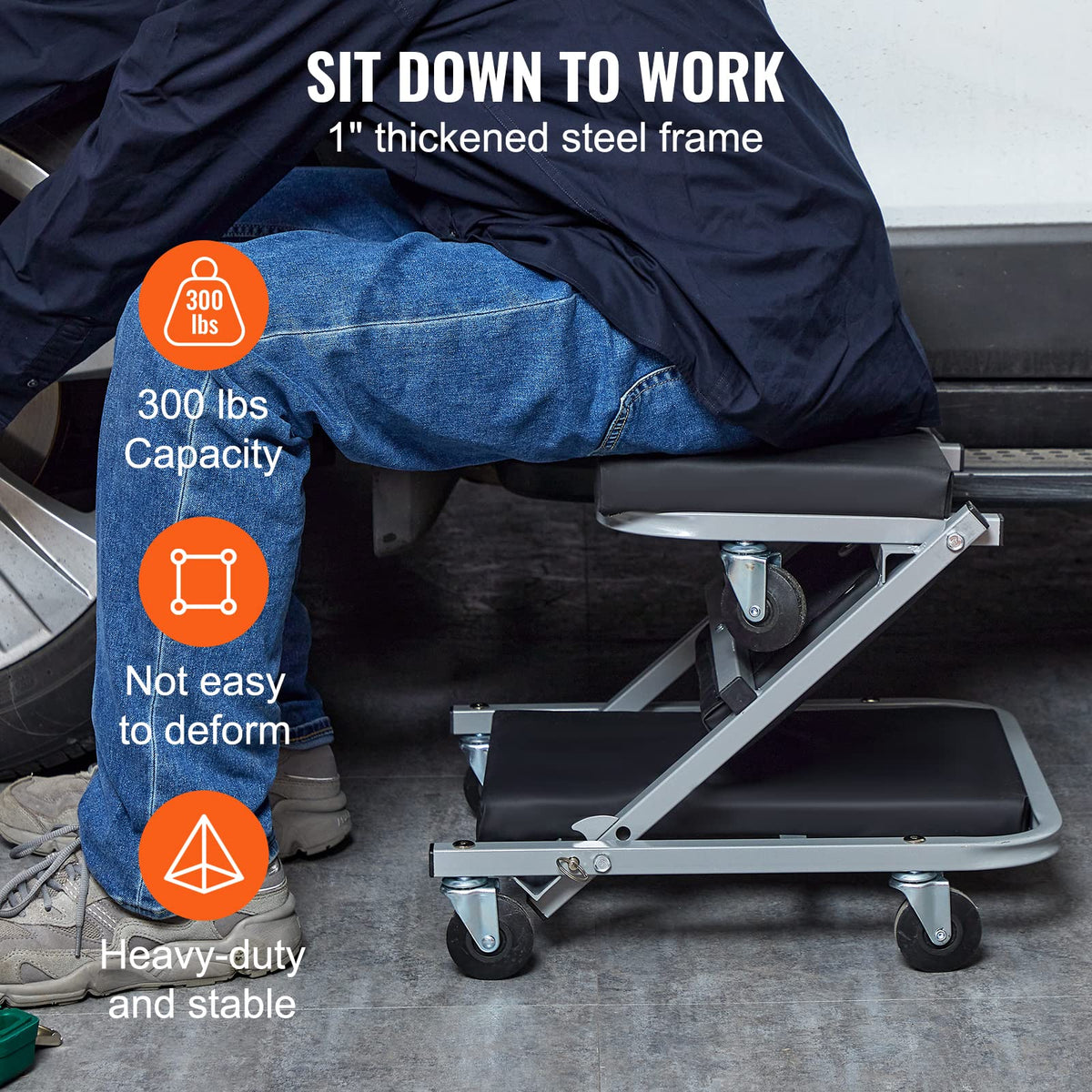 Creeper/Stool All-In-One: Easily Converted From Creeper To Stool For Your Maintenance Convenience. The Mechanic Creeper Can Let You Slide Under Your Vehicle Easily, And The Mechanic Seat Can Let You Sit Down To Work At A Low Place Instead Of Stooping. Great For Your Back And Keens. | Thick & Padded Seat: The Large Vinyl Cushion Is Soft And Won'T Collapse. A Thick Headrest Makes It Comfortable To Lie And Sit, Without Fatigue, Even While Working Long Hours. The Surface Is Waterproof And Oilproof, And It Is Easy To Clean When It Gets Dirty. | Smooth Movement: Equipped With 6 Pcs 2.5'/6.35 Cm 360° Universal Casters, The Creeper Seat Can Be Flexibly Steered Even On Complex Surfaces. Ball-Bearing Pp Casters Are Compression And Wear-Resistant, So You Won'T Have Any Problems Getting Around. Smooth Movement On Different Surfaces. | Heavy-Duty Mechanic Stool: The Creeper Seat Is Constructed From A Thickened Tubular Steel Frame, Holding Up To 300 Lbs/136 Kg. Under The Seat Mode, The Tube Won'T Deform And Roll Over Or Tilt Backward. | A Helping Hand: Ground Clearance Of The Creeper Is Only 3 Inches, Allowing You To Reach A Narrow And Low Clearance Space. The Creeper Seat Is Widely Used In Garages And Repair Shops To Help You Repair Vehicles. Get Your Vehicles Back To Their Prime With Vevor!